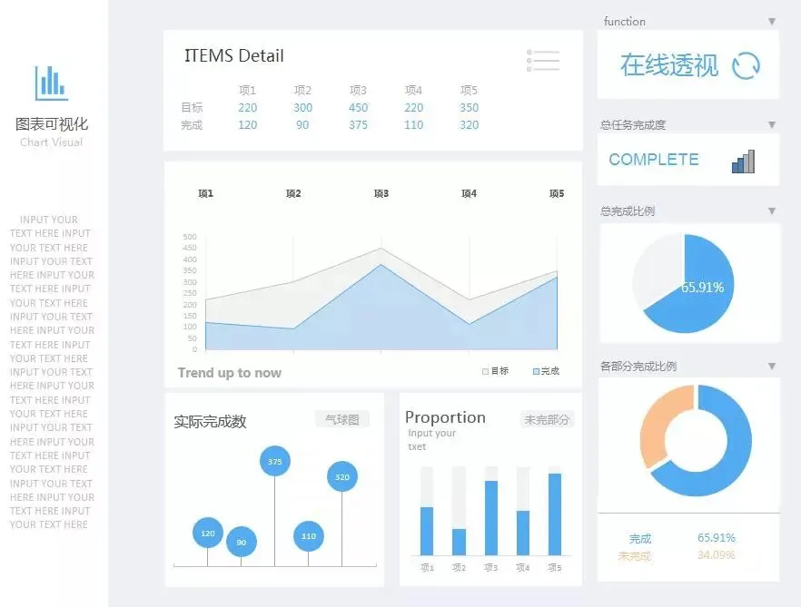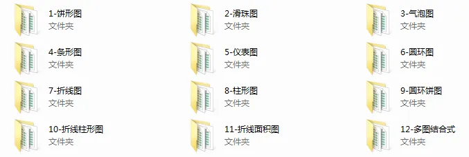 涵盖了饼形图、条形图、仪表图、圆环图、折线图、柱形图等12种工作中常用图形。