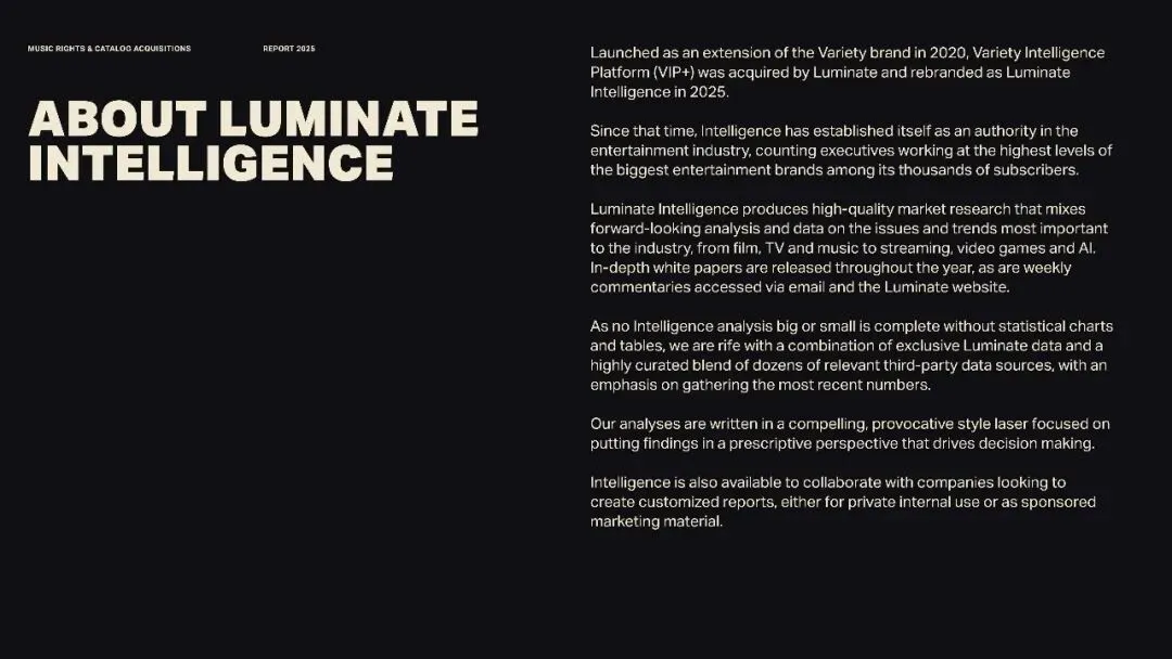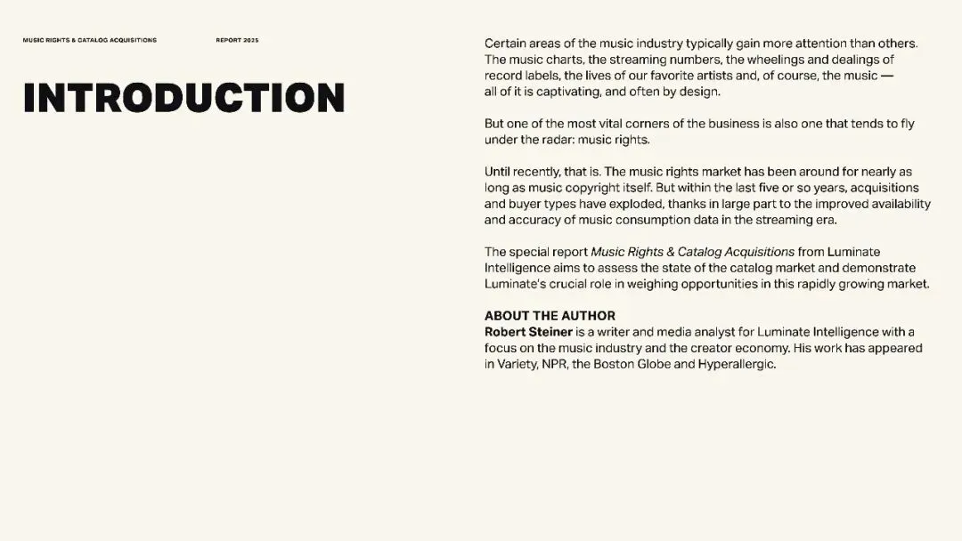 本报告由Luminate Intelligence发布,旨在分析音乐版权与唱片目录收购市场的现状,并展示Luminate在该市场中的关键作用。音乐版权市场近年来迅速增长,成为一种新兴的资产类别,吸引了大量投资者和企业参与。