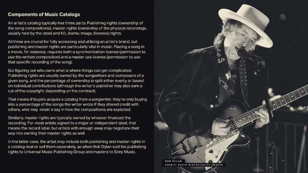 - 知名艺术家:如Bob Dylan、Pink Floyd、Michael Jackson、Queen等,出售其目录以换取高额回报。