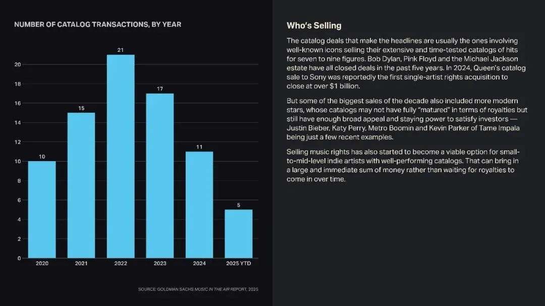 - Queen:2024年以13亿美元出售目录,成为首个达成十亿美元交易的单人艺术家。