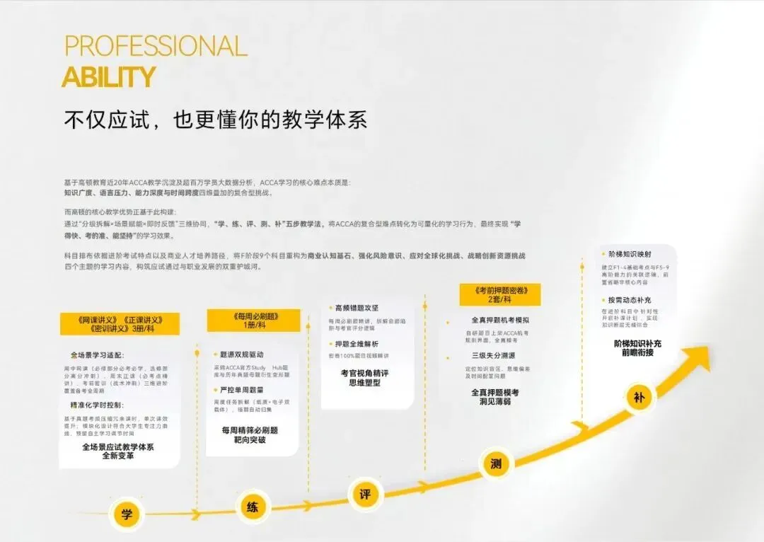 通过“分级拆解×场景赋能×即时反馈”三维协同,“学、练、评、测、补”五步教学法,将ACCA的复合型难点转化为可量化的学习行为,最终实现 “学得快、考的准、能坚持”的学习效果。