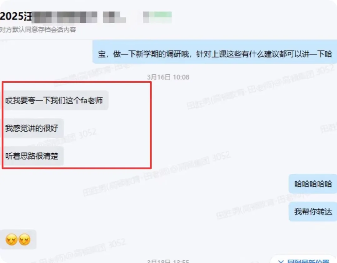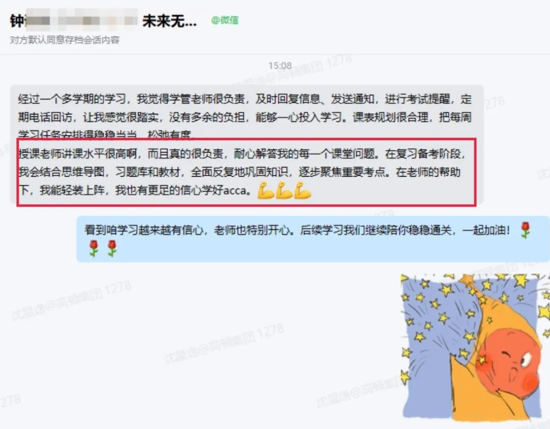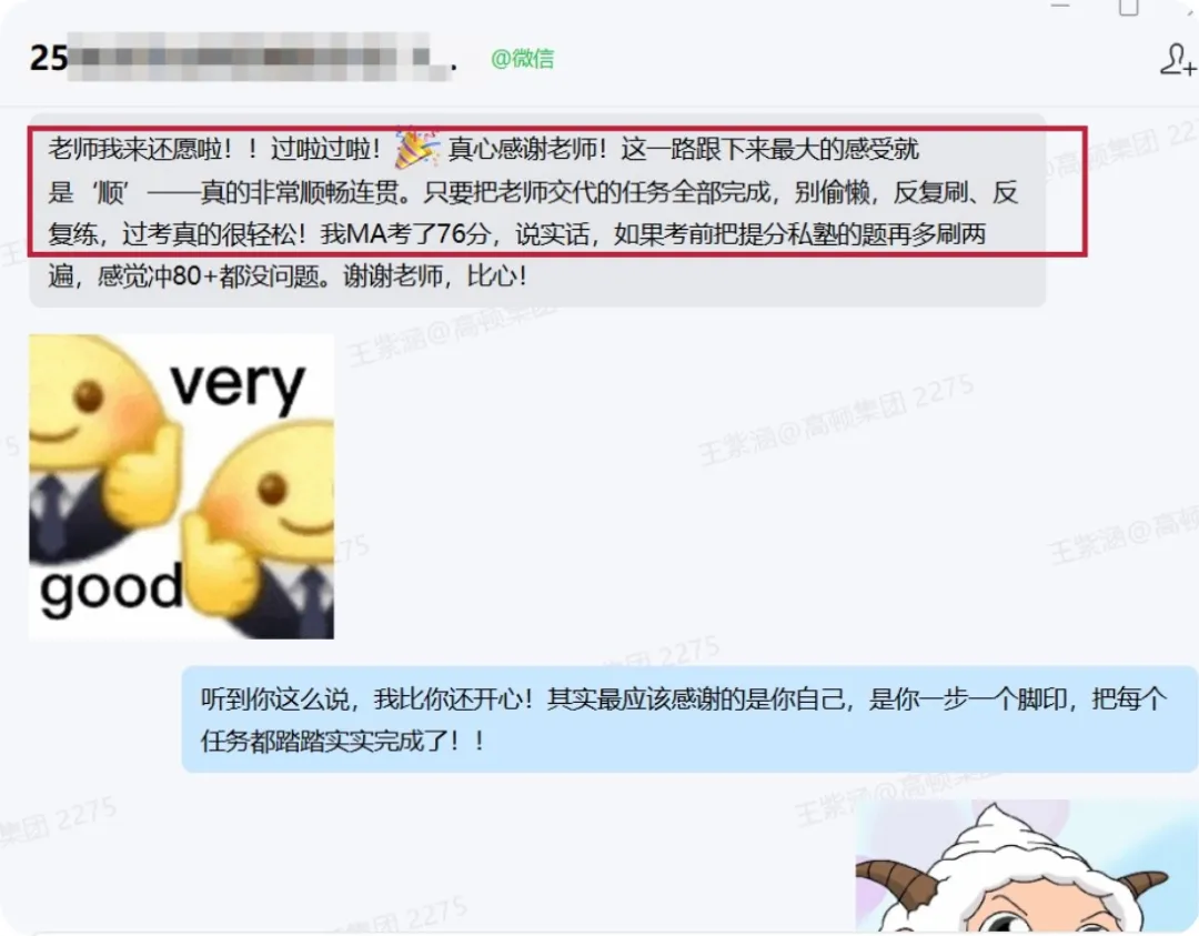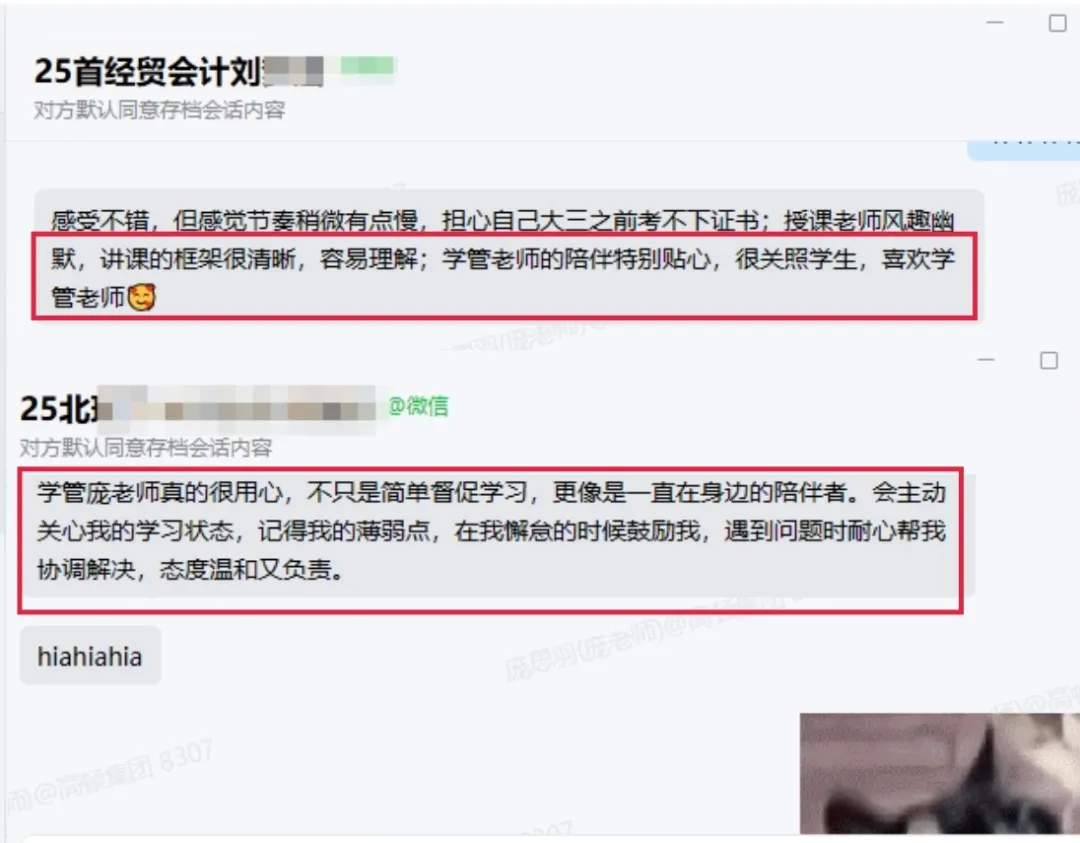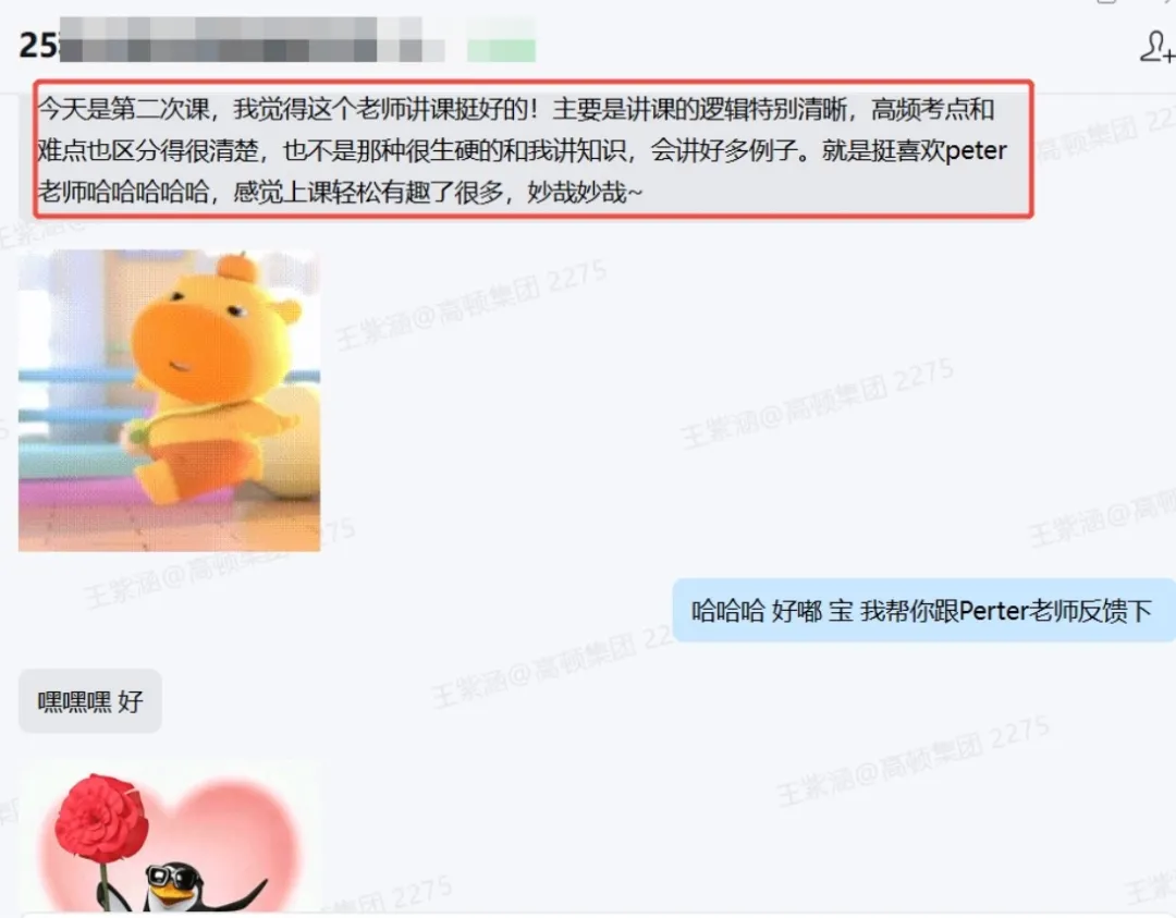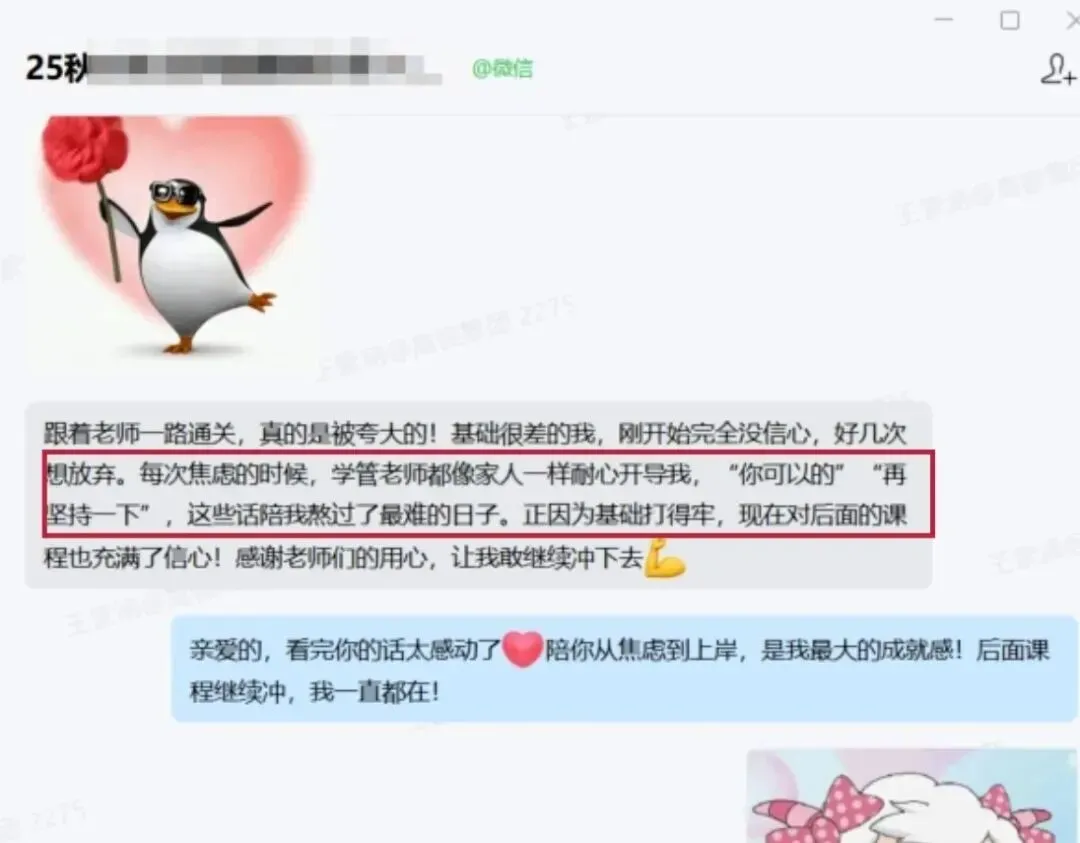 学管庞老师真的很用心,不只是简单督促学习,更像是一直在身边的陪伴者。会主动关心我的学习状态,记得我的薄弱点,在我懈怠的时候鼓励我,遇到问题时耐心帮我协调解决,态度温和又负责。