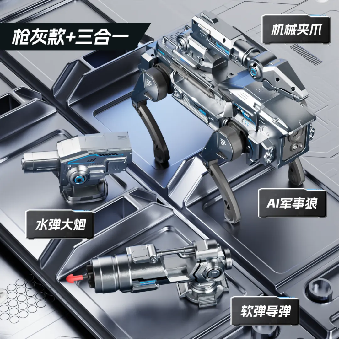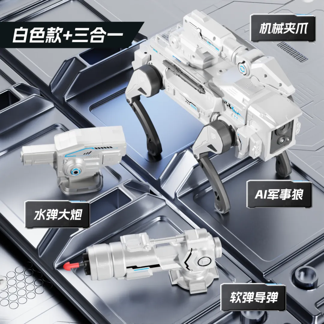 军事狼采用经典的未来机甲造型,线条硬朗流畅,充满力量感与科技感。提供枪灰、纯白两种经典配色可选,枪灰款沉稳霸气,纯白款简约高级。机身采用高强度耐摔材质打造,能够承受日常玩耍中的磕碰与摔落;边角均做圆润处理,无尖锐棱角,全方位守护孩子玩耍安全。