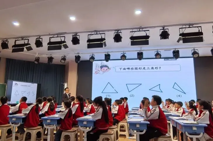 柏溪小学莫建刚老师执教《认识三角形》,立足自主探究理念,以学生为主体设计观察与操作活动,帮助学生找准三角形底对应的高,深刻理解高的意义,精准突破“底与高互相垂直”的教学重点,课堂氛围轻松高效。