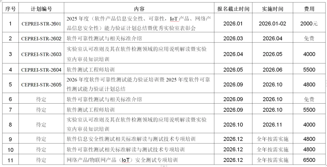 为满足广大实验室对软件能力验证及实验室间比对活动的需求,中国赛宝实验室(能力验证提供者认可编号:PT0072)通过前期准备,发布2026年度软件能力验证及相关工作计划(详见附件1、附件2),各有关机构可以登录中国赛宝实验室软件能力验证管理平台(http://pt.ceprei.com:9091),查询软件能力验证计划相关信息。