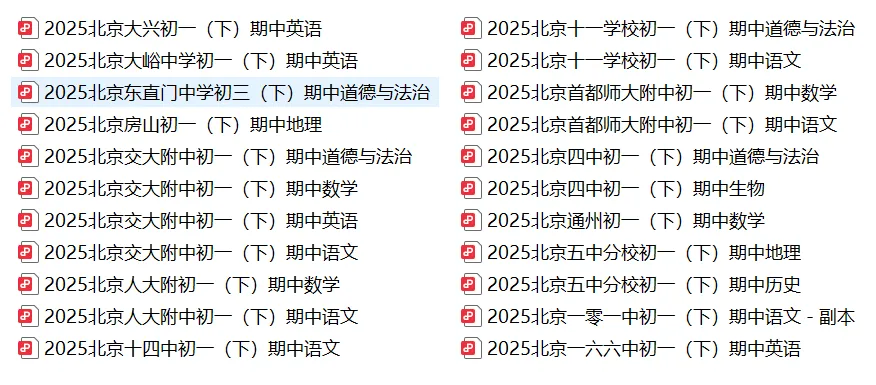 北京2026年下学期期中考试预计将于4月下旬开考,为方便考生练习,特汇总整理了北京往年初一初二下学期期中考试试题及答案PDF版,包括北京二中、人大附中、北师大附中、清华附中、一零一中等重点校2025年初一初二期中考试试题及答案,仅限北京初一初二考生家长,扫码免费预约领取↓