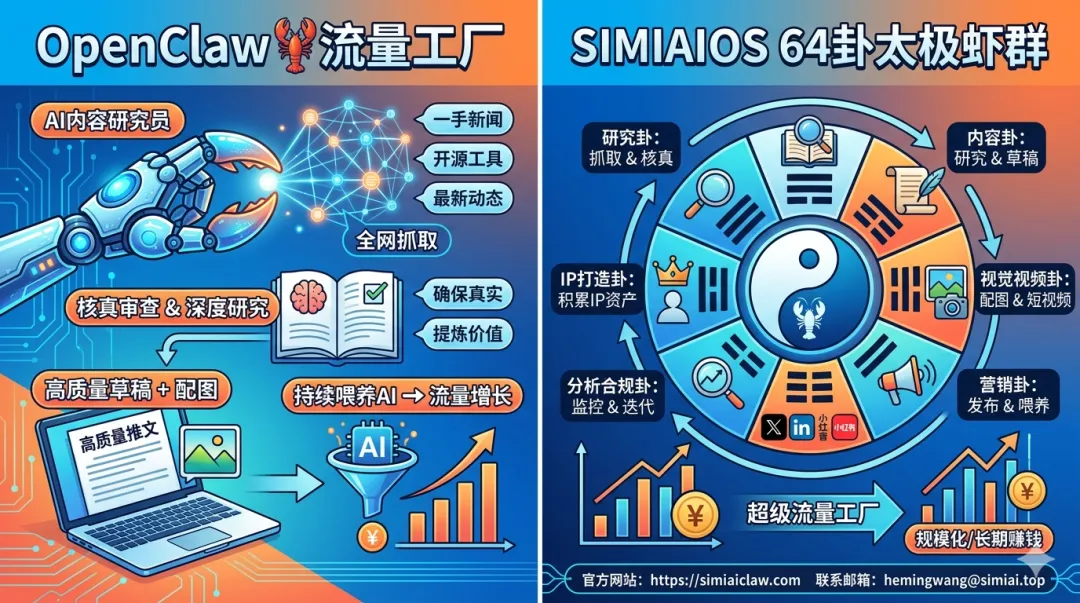 你当前实现的版本已经很强,但用SIMIAIOS 64卦太极虾群可以让它从“一个人能跑”进化成可规模化、可迭代、可长期赚钱的AI内容军团。