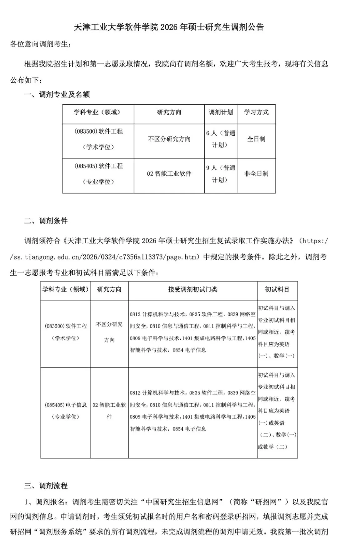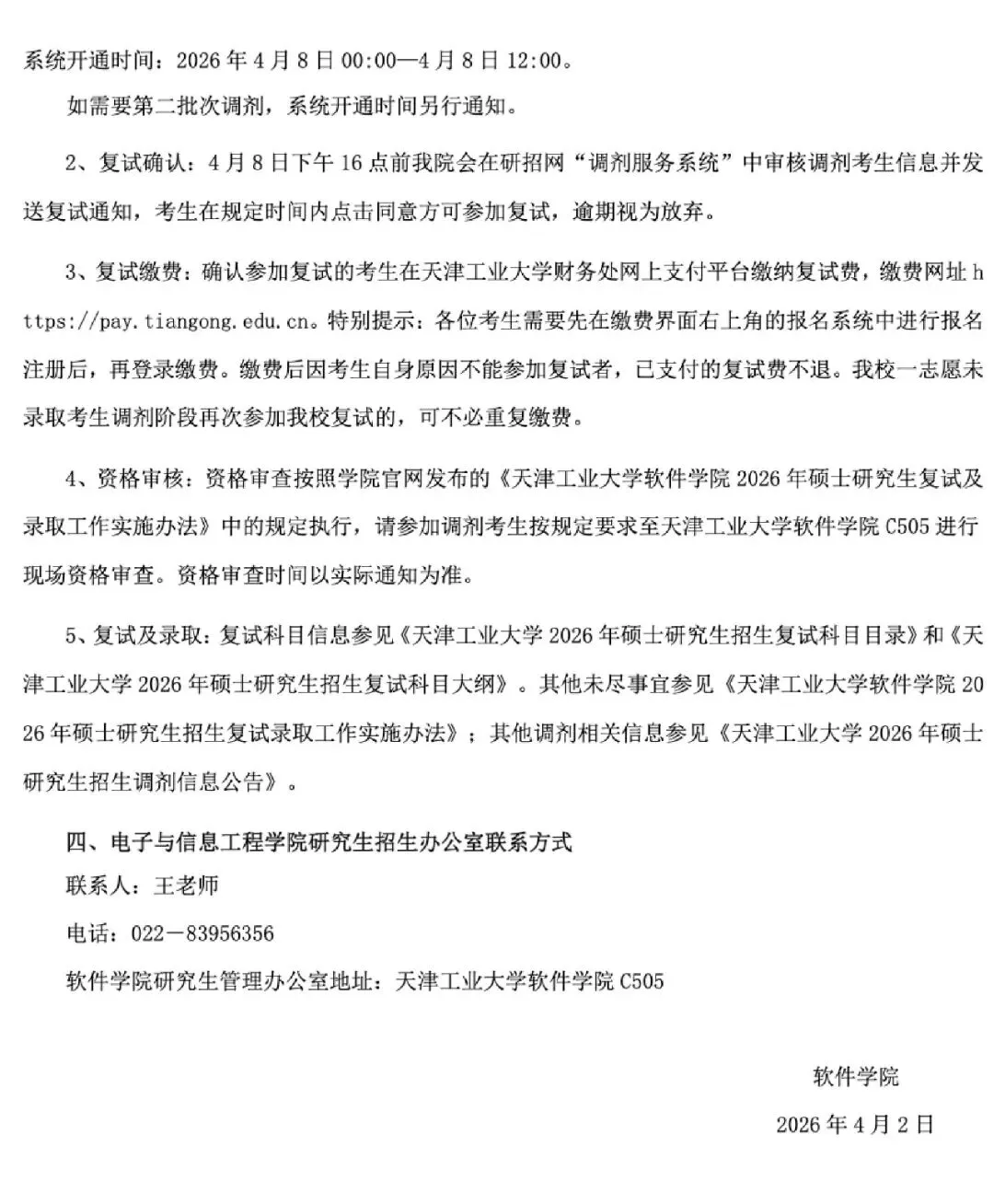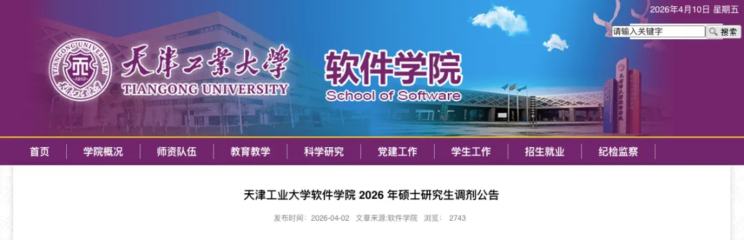天津工业大学软件学院发布2026年硕士研究生调剂公告声明:以下数据来源天津工业大学,如有侵权,请联系删除!2026年4月2日,天津工业大学软件学院在其官方网站上发布了"2026 年硕士研究生调剂公告"的通知,通知原文网址:https://ss.tiangong.edu.cn/2026/0402/c7356a113778/page.htm公告原文: