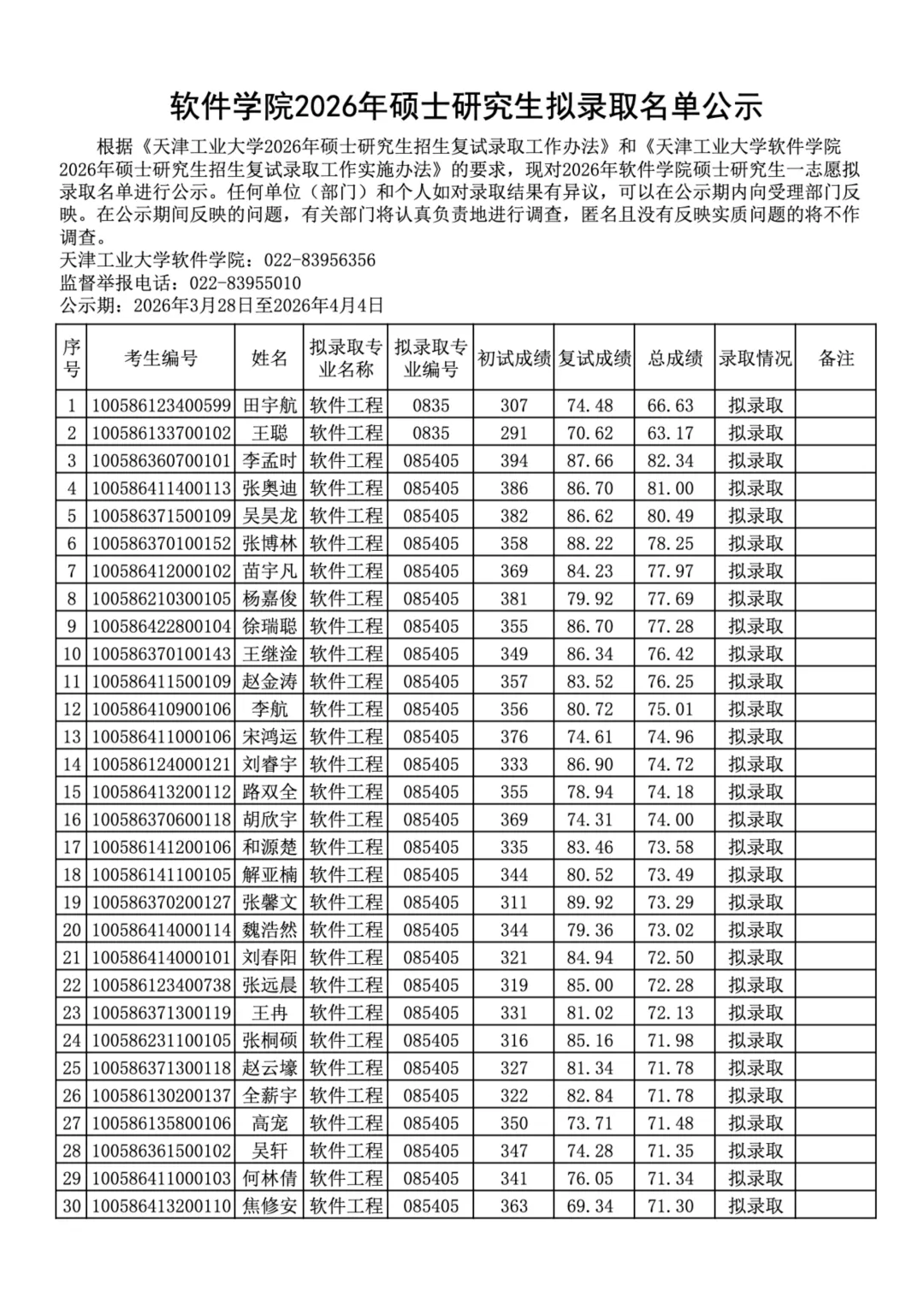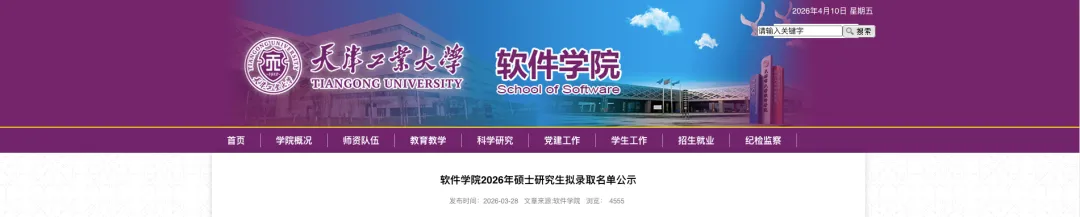 天津工业大学软件学院公示2026年硕士研究生拟录取名单声明:以下数据来源天津工业大学,如有侵权,请联系删除!2026年3月28日,天津工业大学软件学院在其官方网站上发布了"2026年硕士研究生拟录取名单公示"的通知,通知原文网址:https://ss.tiangong.edu.cn/2026/0328/c7356a113587/page.htm2026年硕士研究生拟录取名单: