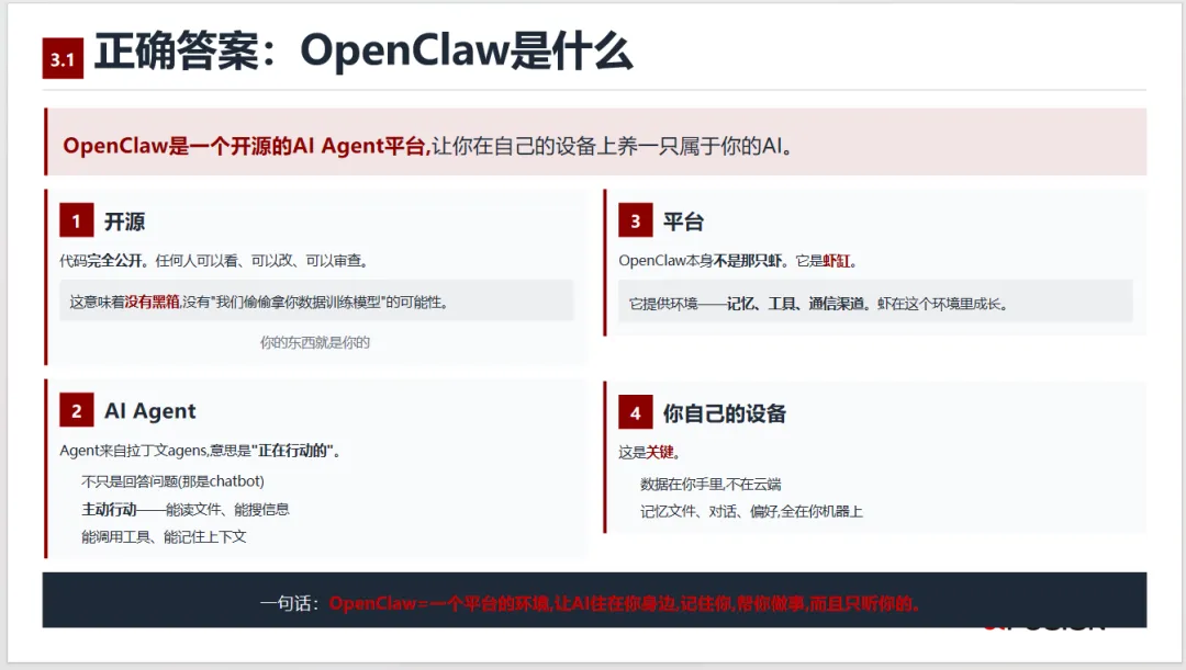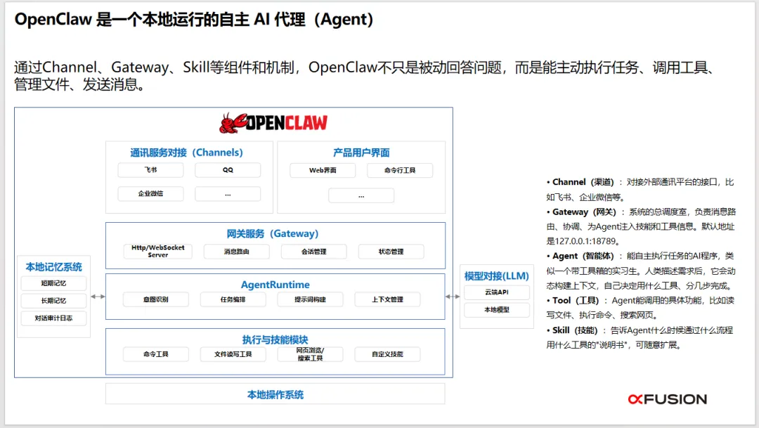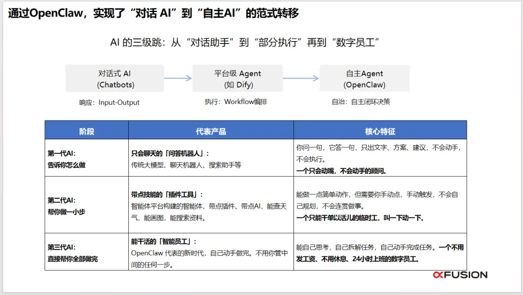 该《企业落地OpenClaw一站式解决方案》旨在解决企业将前沿AI技术转化为实际生产力的核心痛点,其意义重大且深远。方案实现了从“对话式AI”到“自主执行AI”的范式跃迁。 OpenClaw代表的第三代AI,不再是仅能回答问题的聊天机器人或需手动触发的简单工具,而是能自主规划、调用工具、完成闭环任务的“数字员工”。这标志着AI应用从“辅助参谋”阶段迈入了“可交付成果”的实干阶段,为企业自动化开启了全新维度。方案系统性地扫清了企业落地高级AI Agent的关键障碍。 它精准识别并提供了三大挑战的应对之道:通过“Xplay”极简部署和可视化运维降低技术门槛;通过“FusionOne AI”自研推理引擎优化Token消耗与算力成本;通过租户隔离、安全围栏等机制构建企业级安全防护。这种全栈式解决方案将原本散乱、高门槛的开源项目,转化为企业可即开即用、安全可控的生产力工具。方案通过硬件与场景的深度结合,催生了多样化的普惠落地形态。 方案覆盖了从数据中心(FusionOne AI一体机)、部门级工作站(FusionXtation)到个人桌面(FusionXpark)的全场景硬件产品线,让不同规模的组织都能以合适的成本获得本地化部署、数据私有的“数字员工”能力。这种“软硬一体、按需适配”的模式,极大地加速了AI Agent从概念验证走向规模化生产应用的进程。方案的真正价值在于重塑组织与个人的工作模式。 它通过预置和共享的Skill(技能)系统,使“数字员工”能够快速赋能于研发、办公、运维、金融、制造等具体业务场景,将员工从规则明确的重复性劳动中解放出来。这不仅带来效率的指数级提升(如内部实践显示调研效率提升90%以上),更促使人类员工聚焦于需要复杂判断、创造力和战略决策的高价值工作,推动整体人力资本的升级。