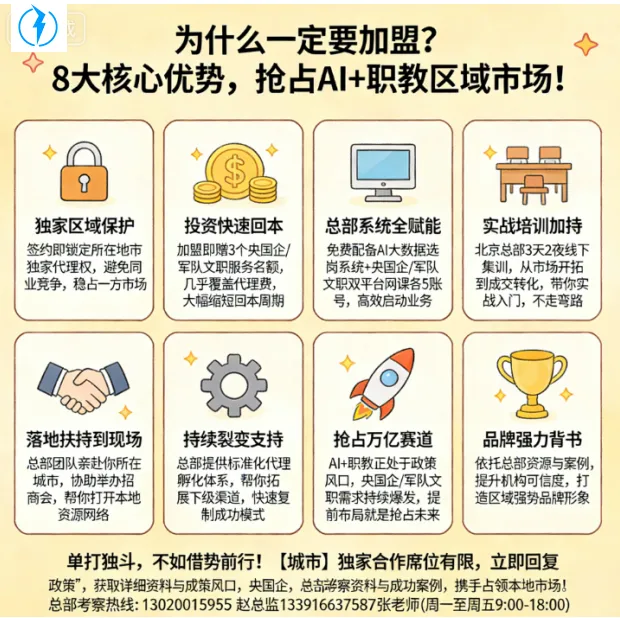 3️⃣ 总部全流程赋能,小白也能快速上手不用自己研发产品、不用学习复杂技术,总部免费配备AI大数据适配系统,还有大学生就业、升学双平台网课各5个账号,一键解锁AI智能服务、课程交付全流程。从前期筹备到后期运营,总部全程兜底,手把手指导,让你快速启动业务,少走弯路!
