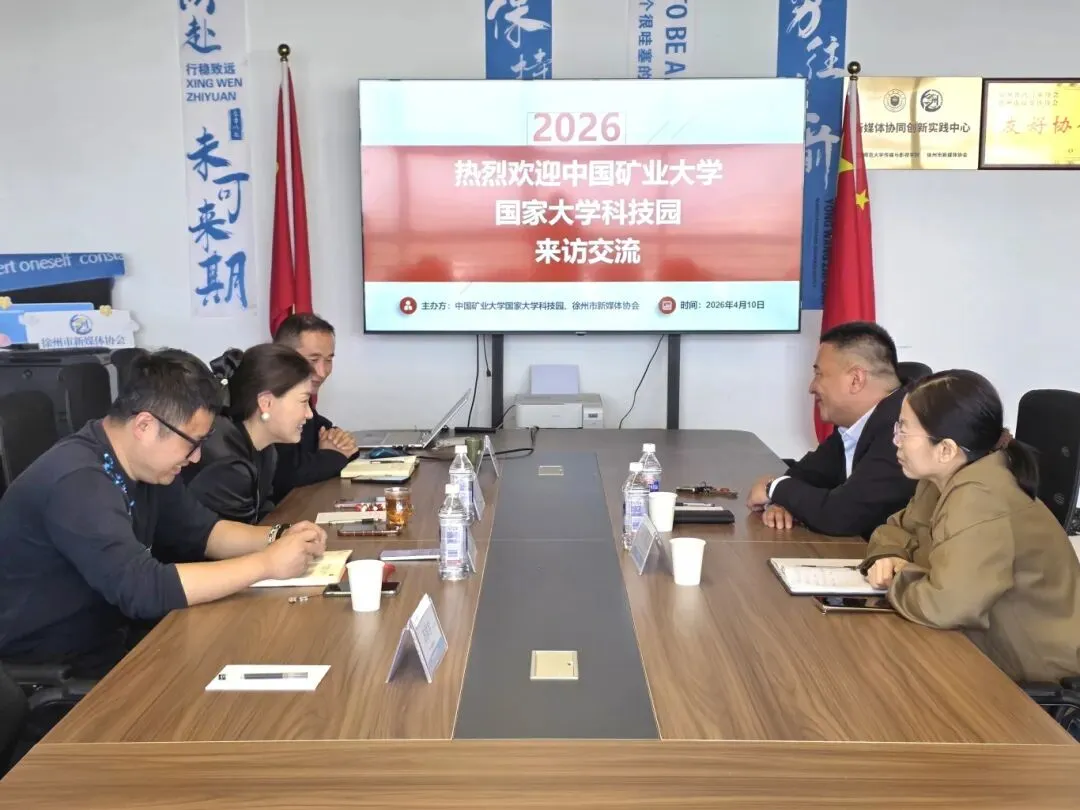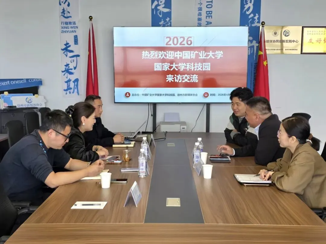 2026年4月10日,中国矿业大学国家大学科技园总经理助理丁庆木、科技服务部副部长程芳一行到访徐州市新媒体协会,双方在协会会议室举行高质量产学研对接闭门交流会。协会副会长兼秘书长徐莉、外联部主任孙毅、办公室主任王端庆、专员陈泉宇等出席接待。