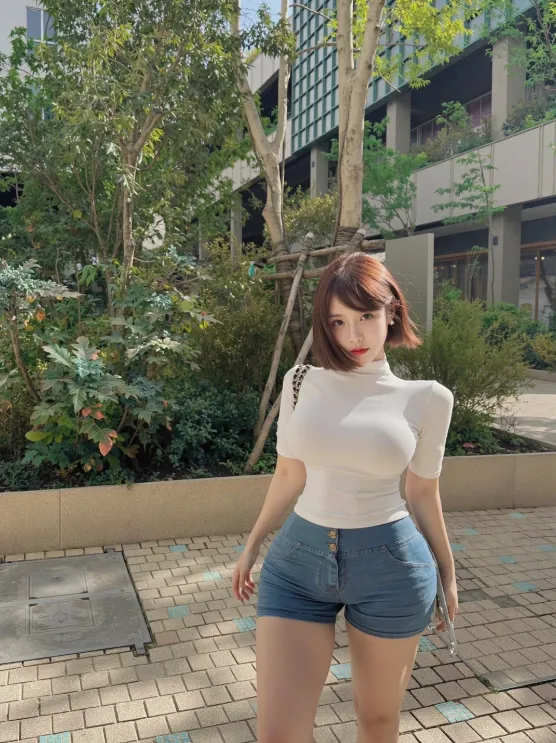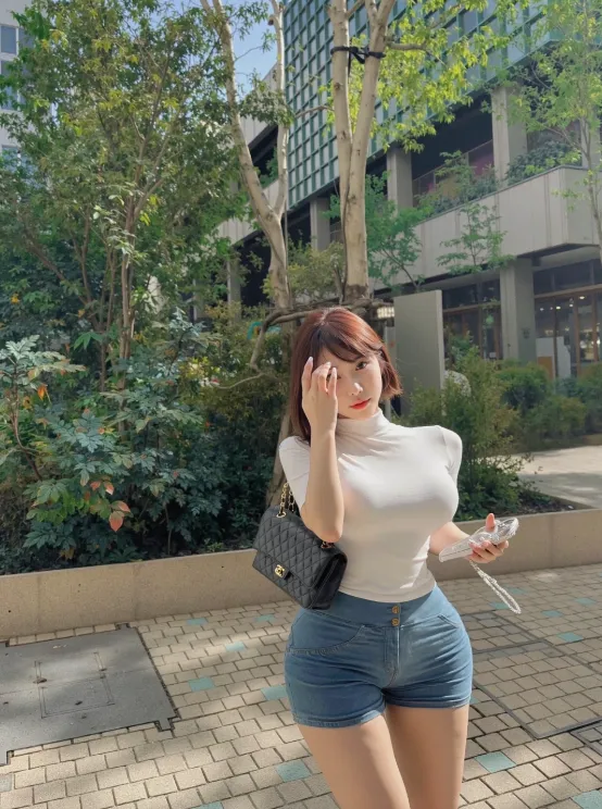 我反复看第三张,越看越觉得妙。白色高领把上半身压得很静,短牛仔又把下半身抬得很轻,中间那一段腰就像被人轻轻往里折了一下,折出来的不是紧,是利落。