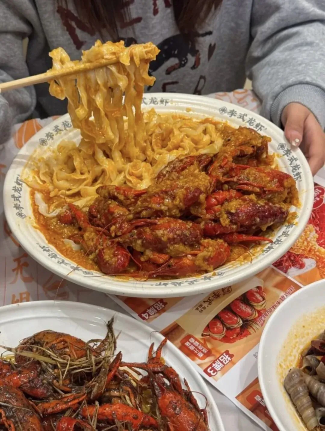 重点来了!吃他家龙虾,一定要加一份干面! 把煮得劲道的干面倒进蒜泥汤汁里,拌匀后每一根面条都吸饱了酱汁,咸香入味,比龙虾还上头,很多老客二刷三刷,全是为了这一口拌面!