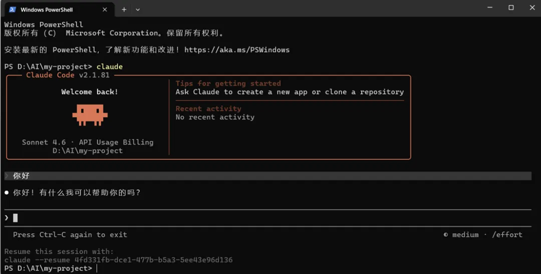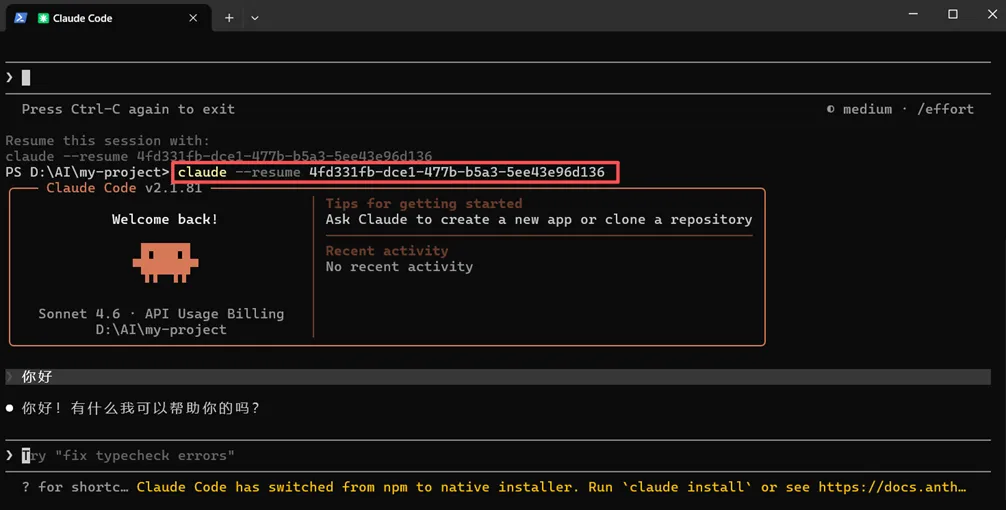 退出对话时能看到当前对话ID。而下次再次进入会话的话,需要在同一文件夹内输入resume命令:
