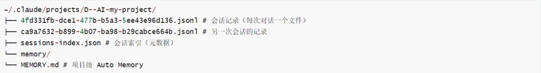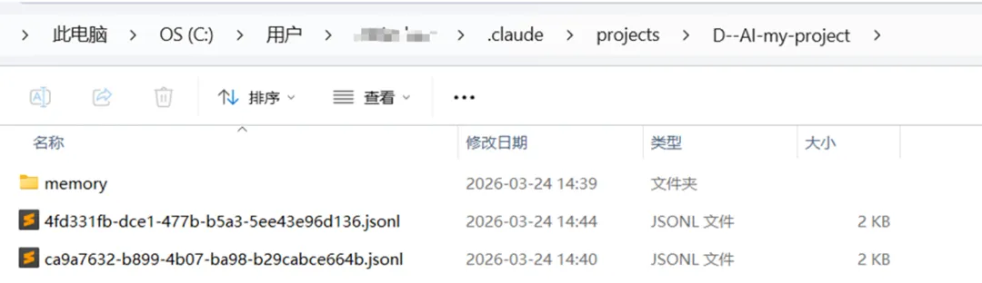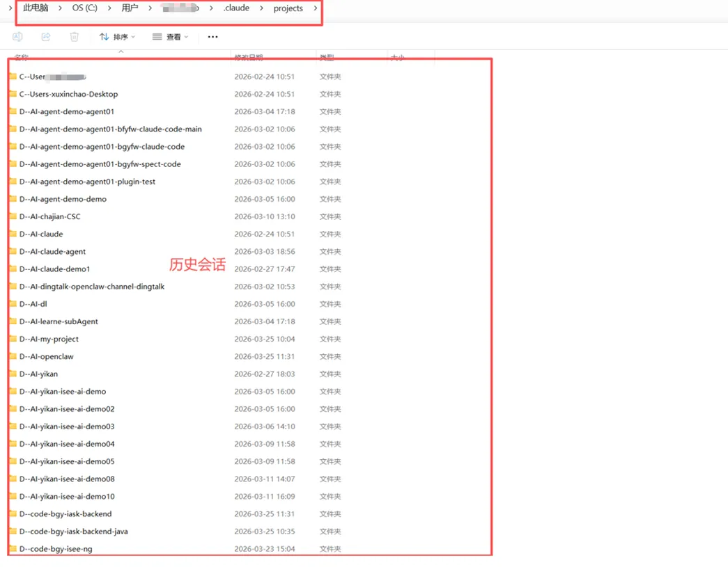 打开~/.claude/projects/目录,可以看到Claude Code会话存储的全貌。每个项目目录的绝对路径会被编码为一个文件夹名,路径分隔符替换为连字符: