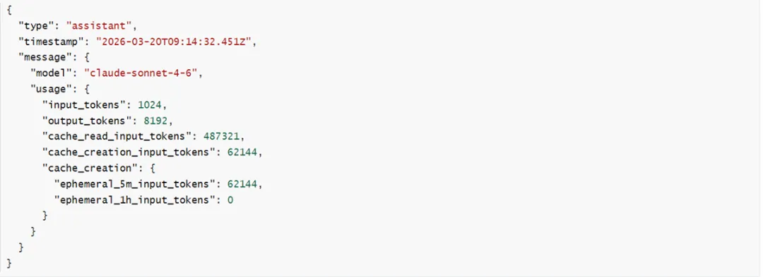 以获取Token用量为例,打开一个JSONL文件,每一行是一条消息记录。找到type=“assistant”的行,里面有关键的usage字段,详细记录了某次对话的Token用量:
