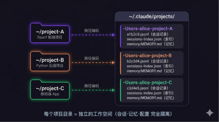 核心认知:Claude Code不是“通用对话工具碰巧能写代码”,而是“项目级Agent碰巧通过对话交互”。每个项目目录就是一个独立的工作空间,会话、记忆、配置三者在目录维度上完全隔离。