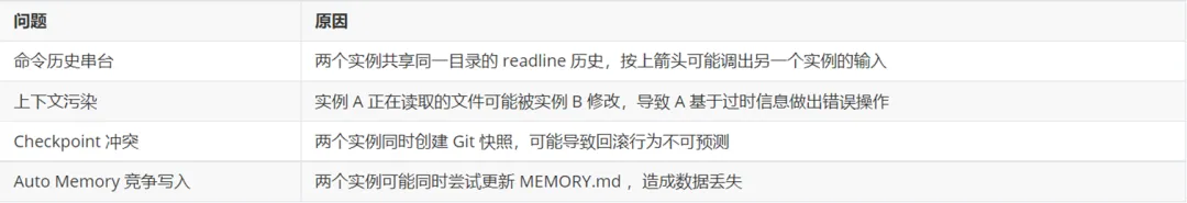 在快速响应需求迭代与Bug紧急修复时,部分工程师为提升效率,尝试在同一项目目录下开启多个Claude Code实例,试图同时处理新功能开发、线上Bug修复等并行任务,结果出现开发上下文污染、Checkpoint冲突、Auto Memory数据丢失等问题,特别是造成冲突之后,需要花费更多的Token与时间去解决,进一步加剧了复杂任务的开发风险与时间成本。