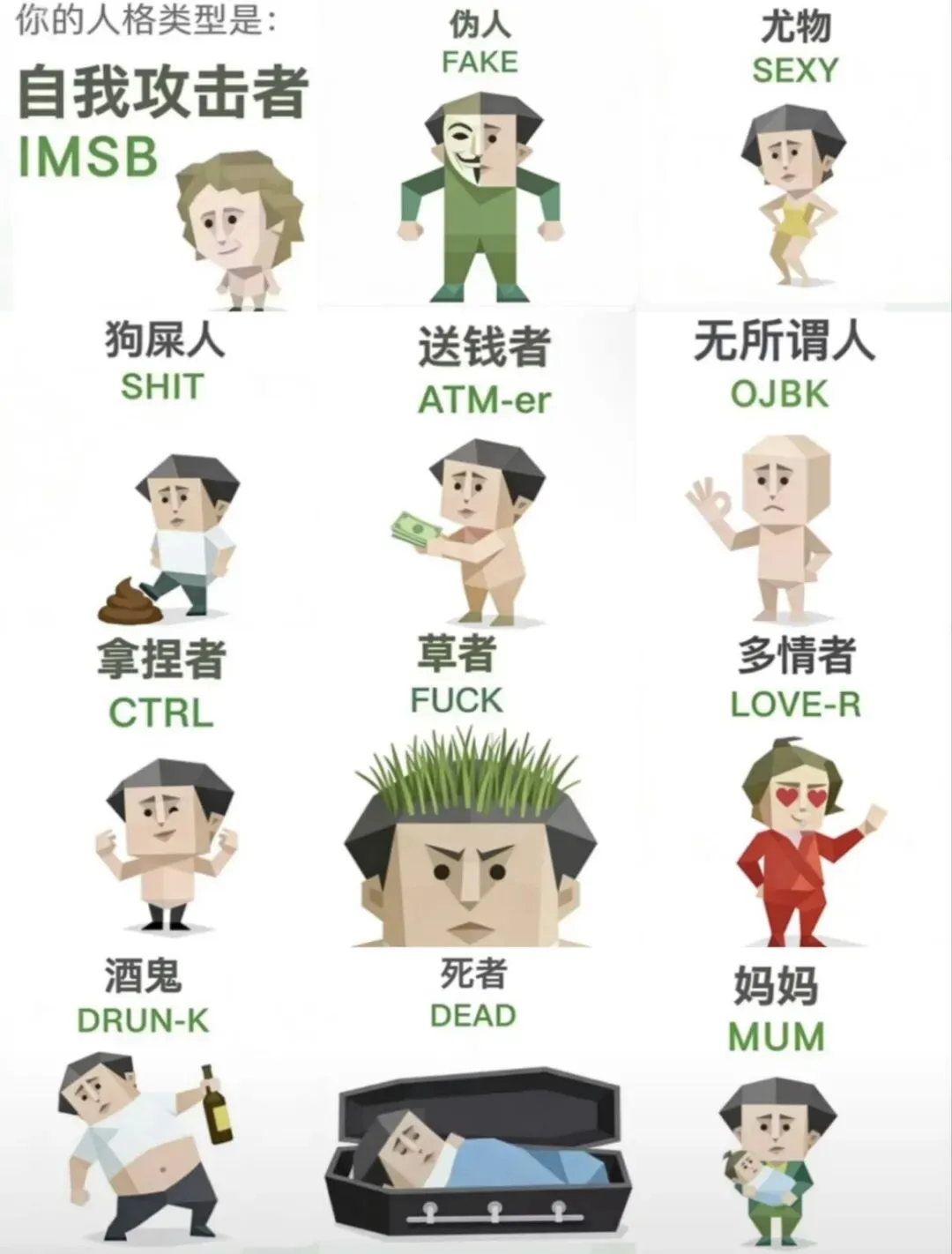 更偏激一点的,有同事测出个IMSB(自我攻击者),更有网友戏称自己为SHIT(愤世者),甚至还有人测出来自己确诊为死者,特征是只要一上班就原地失去生命体征。