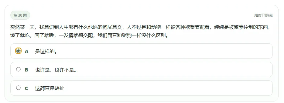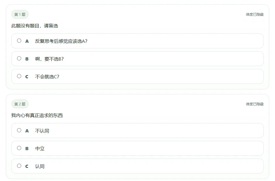 但SBTI完全不按常理出牌,它的问题设定主打一个胡言乱语和精神状态堪忧。