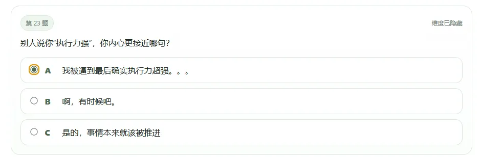 接下来整个测试,几乎全都是这种极具拉扯感和发疯潜质的送命题,比如“我被逼到最后确实执行力超强”。