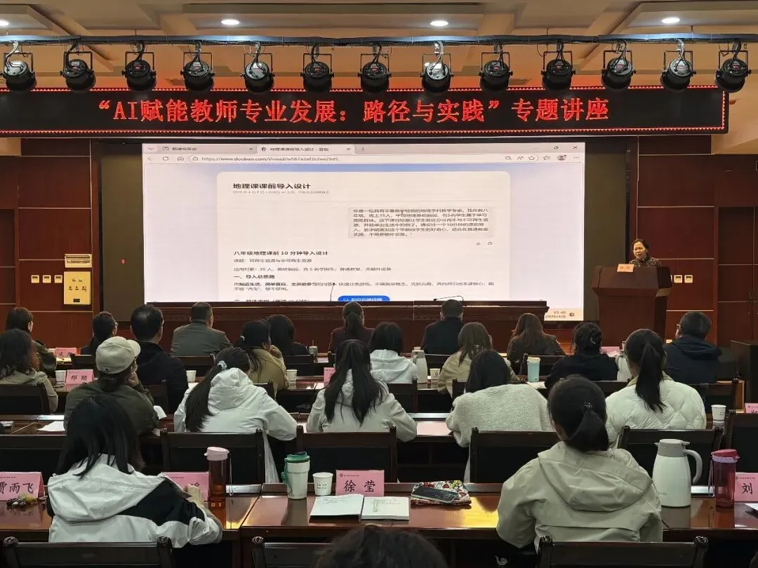 为深入贯彻习近平总书记关于人工智能与教育数字化的重要论述,落实陕西省推进“人工智能+教育”行动计划(2025-2027),切实推进我校教育数字化转型,提升教师数字素养与智能化教学能力,4月8日下午,我校特邀正高级教师、特级教师、陕西省教育科学研究院教师发展研究所所长白珍老师作“AI赋能教师专业发展:路径与实践”专题讲座。全体教师参加,副校长边小卫主持。