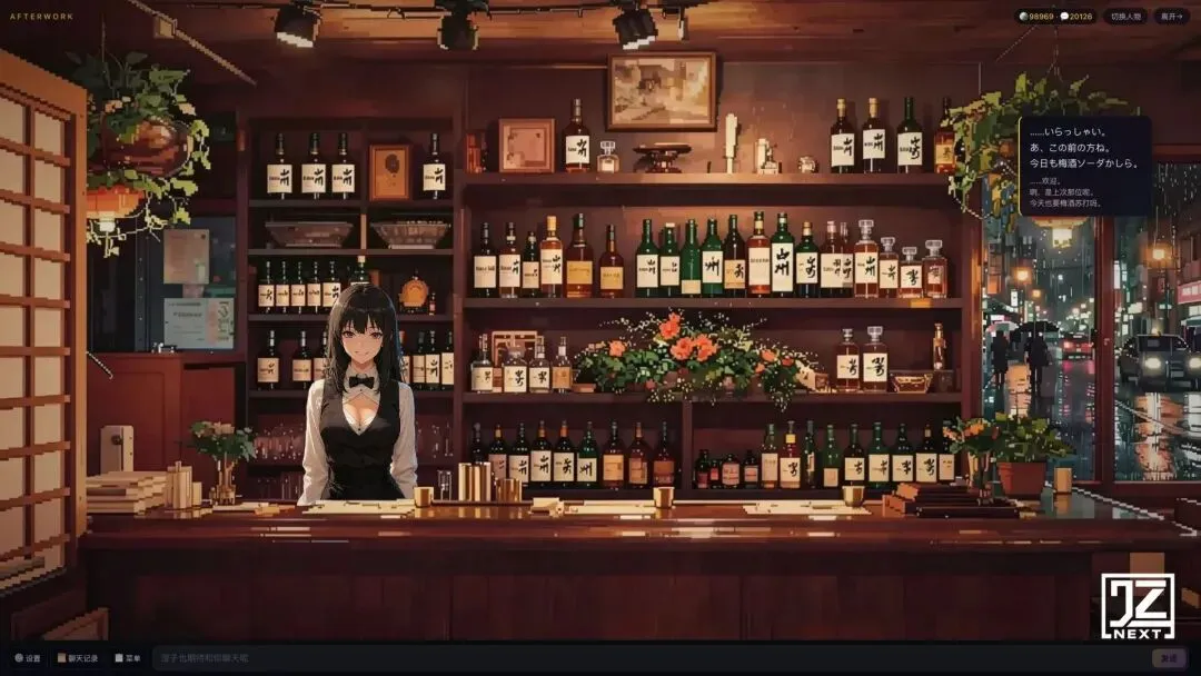 【产品截图:AfterWork 主界面——像素风日式吧台,澄子立绘站在吧台后,雨天动效窗外街景,BGM 波形浮动】