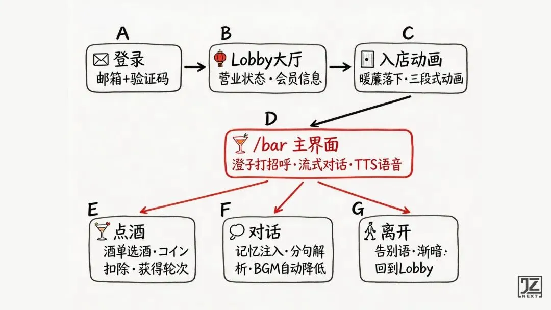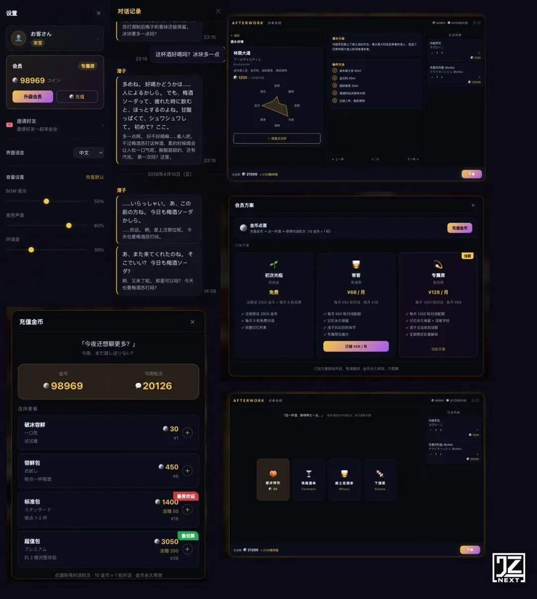 东京スナック真实单杯价格是 JPY 500-1500,换算成人民币大约 40-120 块一杯。用户点酒的时候感知到的是「比真的去日本喝便宜多了」,而不是「我在给 AI 充值」。