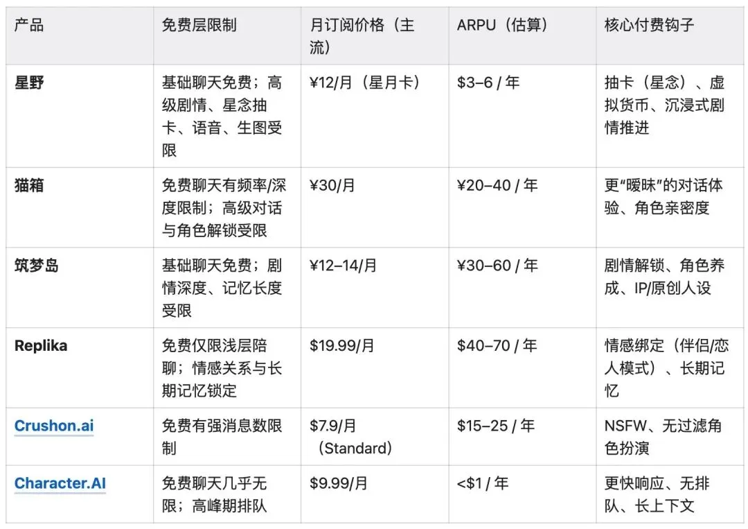 第一,免费层无限 = 自杀。Character. AI 免费无限对话,ARPU 只有 $0.72,付费率不到 0.1%。用户没有任何动力付费,产品再好也是白教育市场。