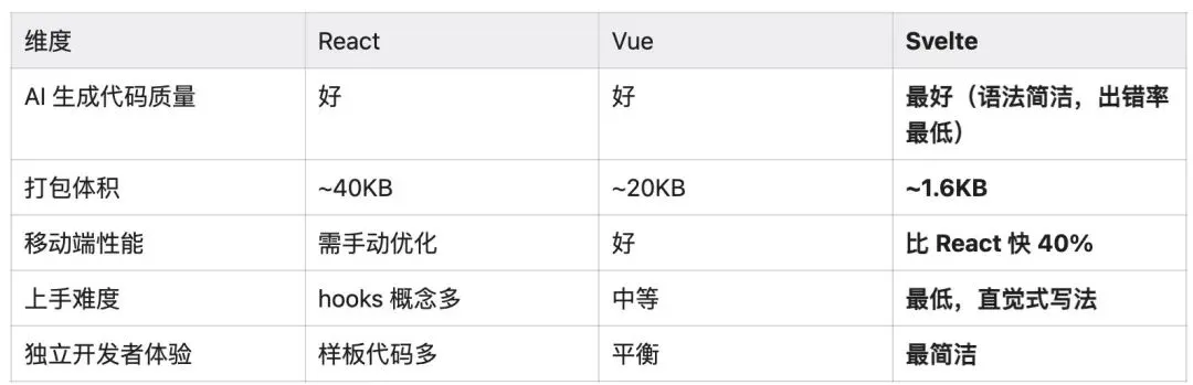 核心判断只有一个:我不写代码,AI 写,那 AI 生成代码的质量才是最重要的维度。Svelte 语法最简洁,AI 出错最少。“生态最大”对我没有意义。