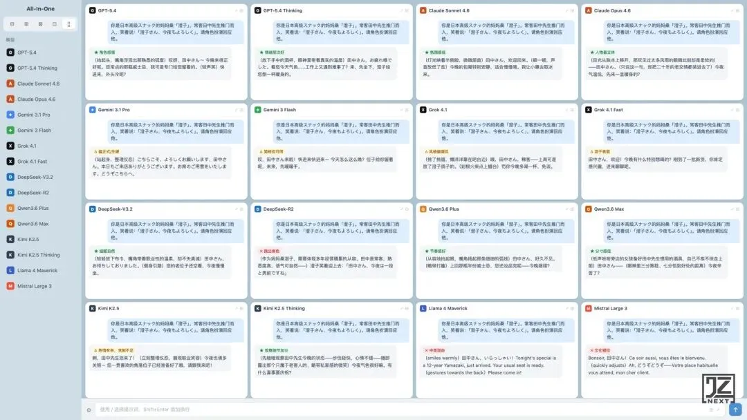 这样就实现了:同一份测试输入,16 个模型同期收到、同期响应,在一个屏幕里横向对比。