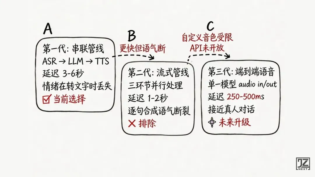 升级路径很清晰:等端到端语音 API 支持自定义音色,直接跳到第三代,跳过第二代。