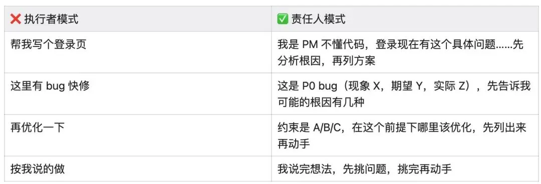 执行者模式里 AI 直接动手,出了问题不知道根因,也不知道怎么自查。大多数时候出问题不是 AI 能力不够,而是没给它足够的责任感——把脑子交给它,它就只用了手。