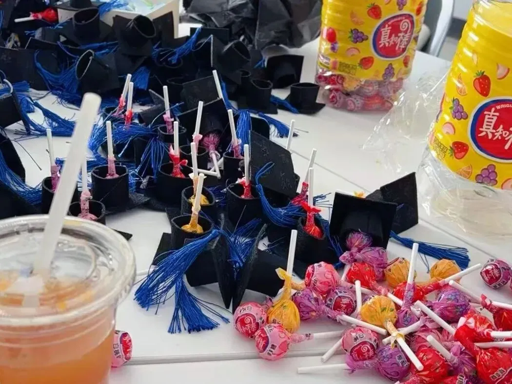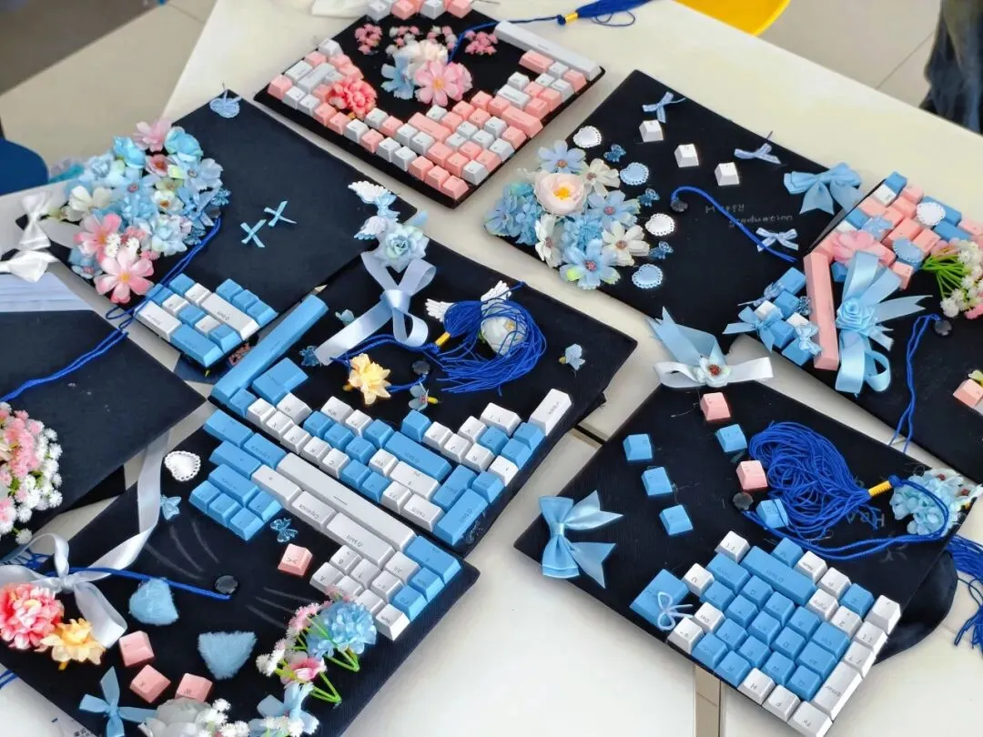 平日里承载着繁重算法与指令的键盘帽,在毕业那一刻,被赋予了感性的生命。同学们发挥奇思妙想,将电子元件与鲜花、丝带重组,用最熟悉的方式诠释了何为“工科浪漫”。有人用“Enter”键寓意开启新程,有人将“Ctrl+C”编织进发丝,试图复制这段不可替代的时光。