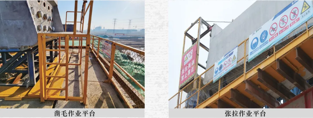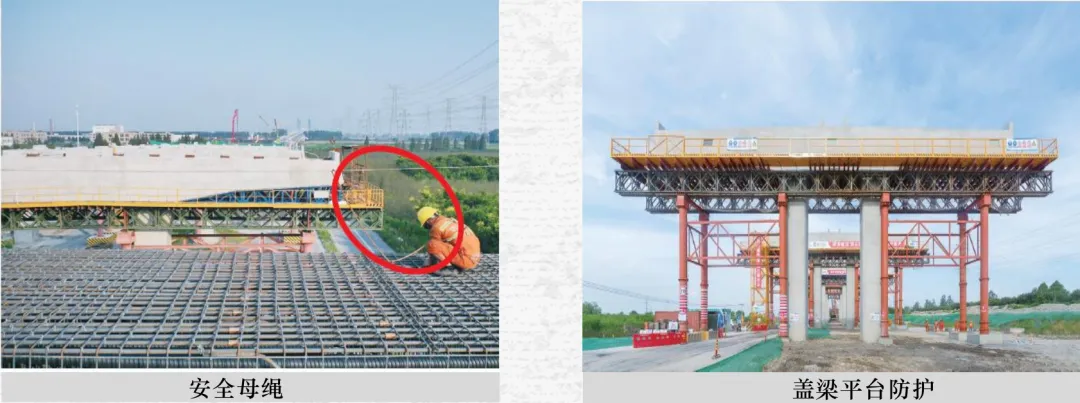 3、在盖梁上进行作业前,必须规范设置安全母绳,施工人员系好安全带;盖梁平台搭设时,四周应提前设置临边护栏,并在平台空隙处挂设安全网。