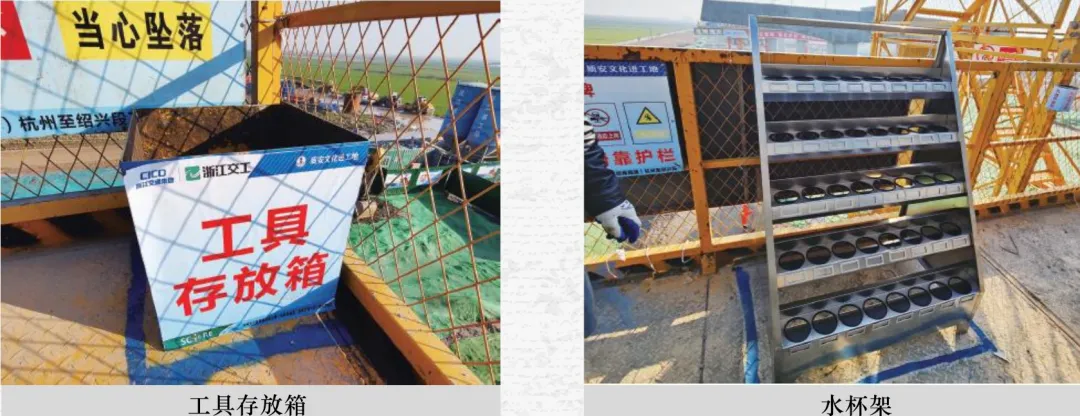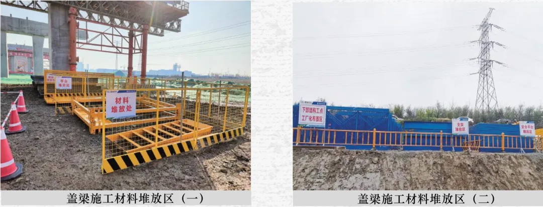 现浇盖梁施工现场按照标准化布置,分为盖梁作业区、吊装区、模板存放区、安全设施存放区等,并将盖梁施工平台上的螺母、波纹管、扎丝等物品存放进行划区布置,做到物品放置整齐有序。