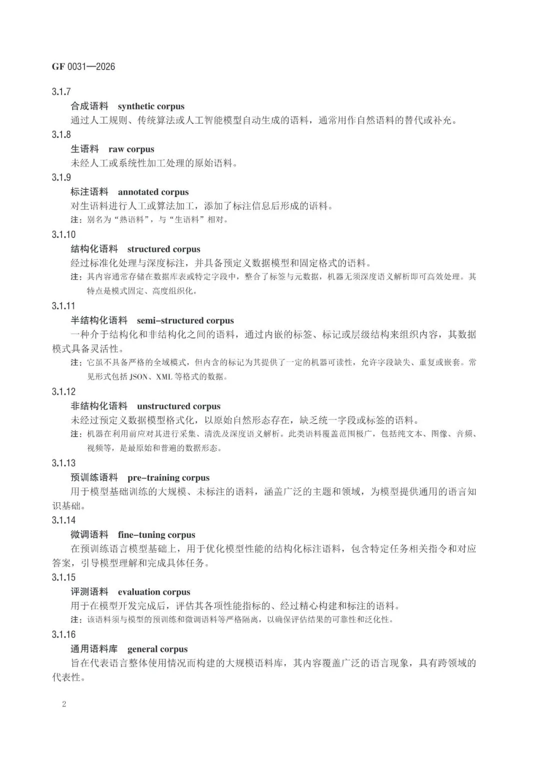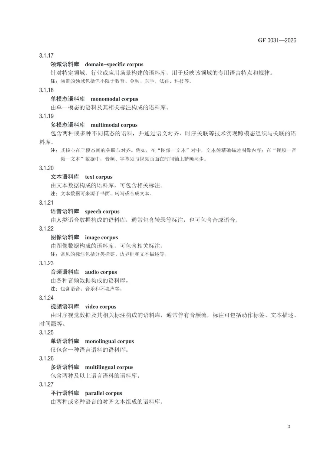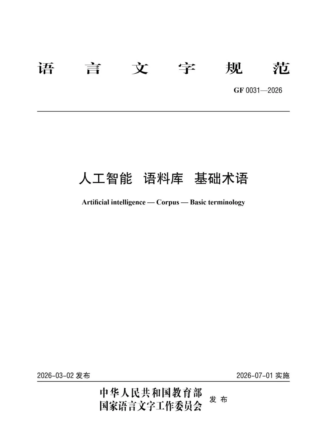 下载收藏丨语委规范《语料库基础术语GF0031 2026》发布近日,教育部、国家语言文字工作委员会正式发布两项语言文字规范:《机器合成普通话水平测评等级标准及测评大纲》和《人工智能语料库基础术语》,标志着我国在人工智能语音技术与语言规范融合发展方面迈出关键一步。其中,《人工智能语料库基础术语》聚焦语料库领域的基础概念与核心术语,对相关术语的定义、内涵及使用范围进行了系统规范,旨在解决当前语料库建设与应用中术语使用不统一、概念界定不清等问题。该标准面向人工智能语料资源建设与应用需求,构建统一、规范、可复用的术语体系,是语料工程领域的重要基础性规范。标准全文现已在教育部官网发布,点击本页面左下角“阅读原文”下载,也可识别以下二维码或通过以下链接获取:http://www.moe.gov.cn/jyb_sjzl/ziliao/A19/202604/t20260407_1433016.html来源:教育部官网、语言资源高精尖创新中心