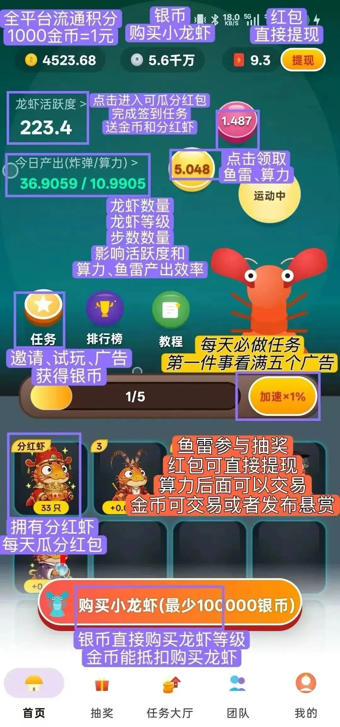 1、把5个加速广告看完,有时间的情况下可以把任务的10个广告看完,获得200万银B,可购买龙虾,攒的银B越多,可买的龙虾等级越高;