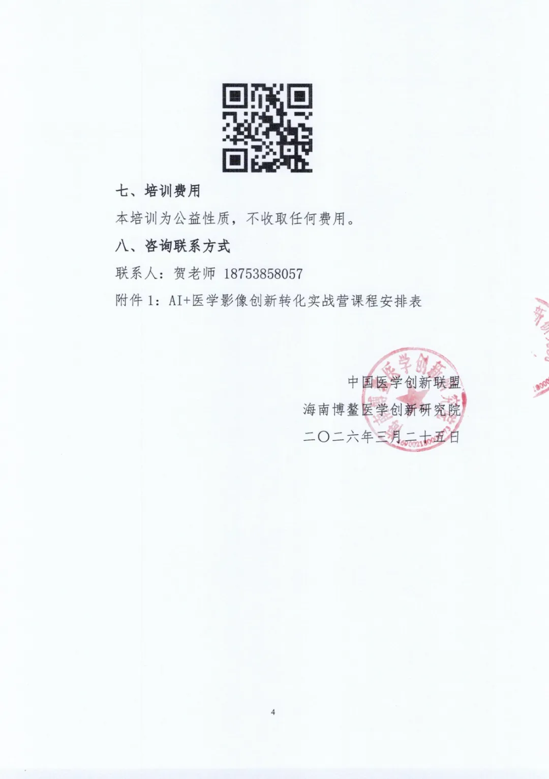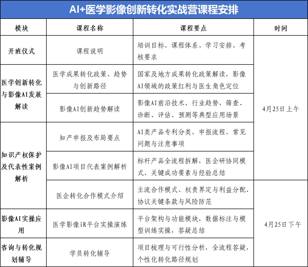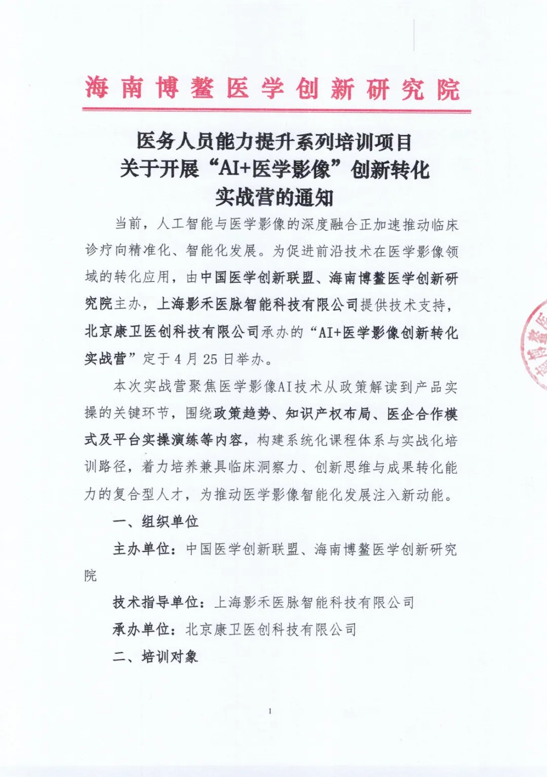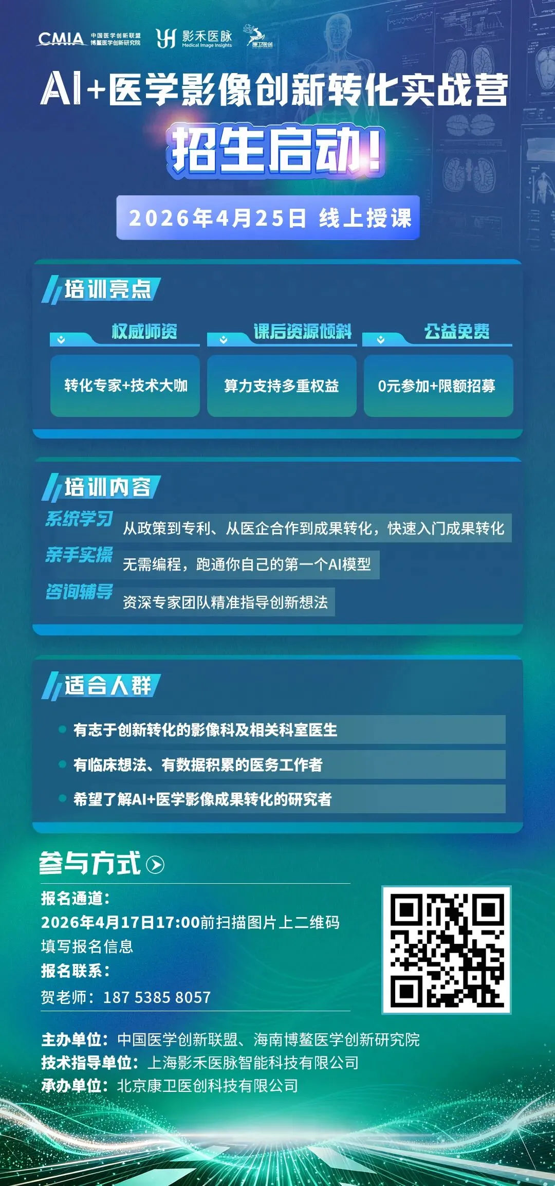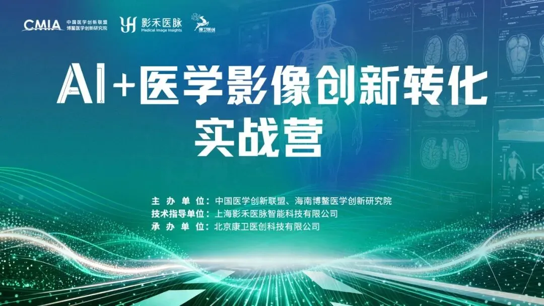 由中国医学创新联盟、海南博鳌医学创新研究院主办,上海影禾医脉智能科技有限公司提供技术指导,北京康卫医创科技有限公司承办的“AI+医学影像创新转化实战营”,将于2026年4月25日线上开展,现面向全国医学影像及相关领域医师、科研人员和医院相关人员正式招募!本次课程为公益性质,免费开放报名。