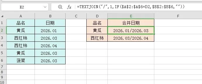 =TEXTJOIN("/",1,IF($A$2:$A$6=D2,$B$2:$B$6,""))