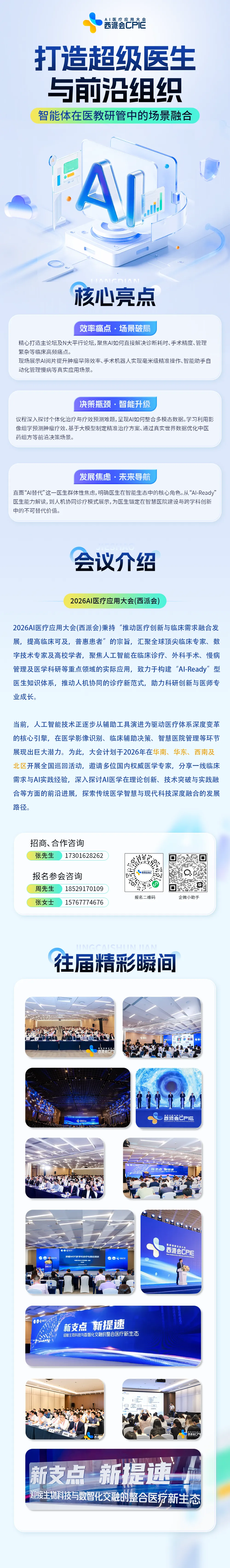 在这里,您将接触到前沿的AI医疗应用案例,见证技术如何赋能早期筛查、手术规划、个性化治疗等临床实践;您也将与来自全国的同道深入交流,共同探索人机协同的诊疗新范式。