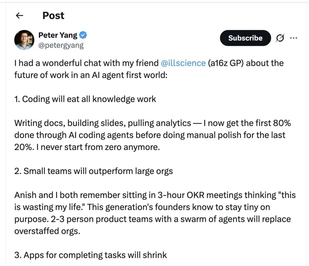 最近,Peter Yang和a16z合伙人Anish Acharya录了一期播客,聊了AI agent时代工作形态的5个预言。有些正在发生,有些还只是预判。但方向是一致的:工作的基本单元,正在从"人"变成"人+agent配置"。而配置差距,正在成为新的能力差距。