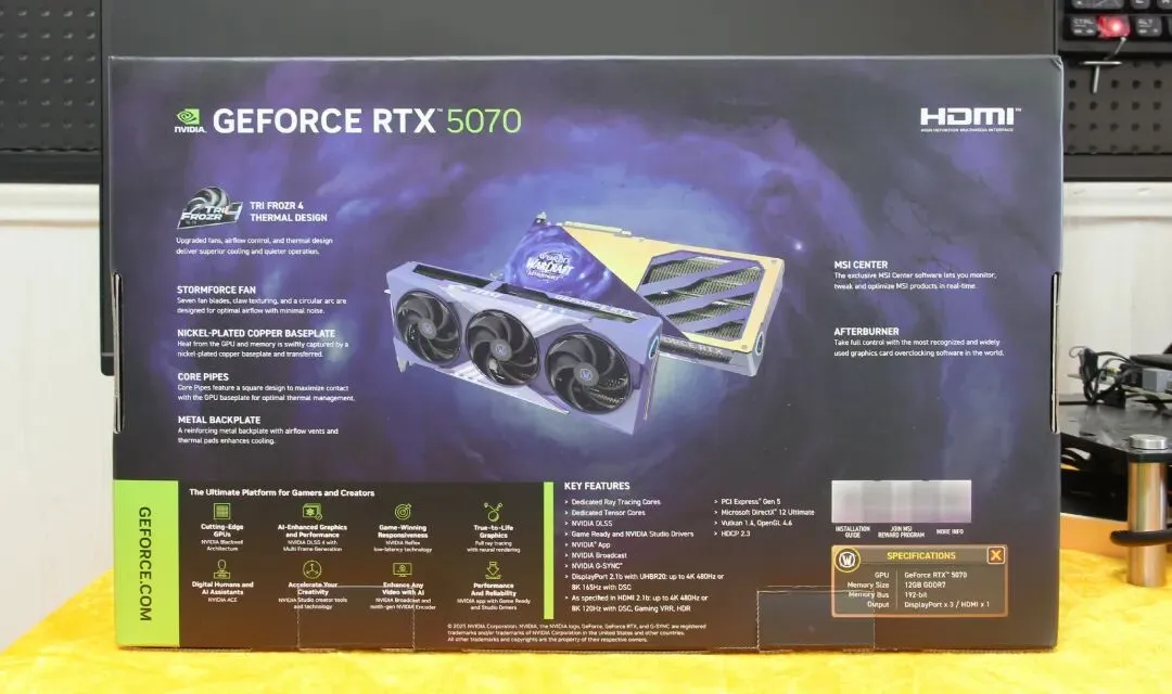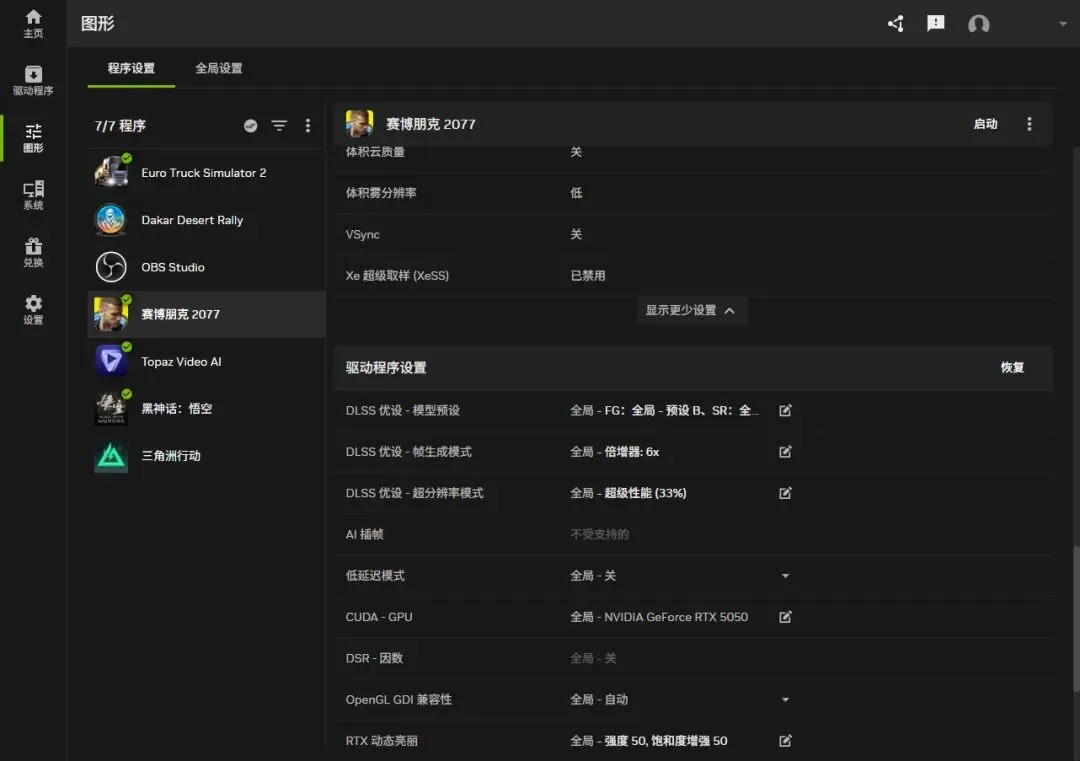 还不更新驱动?NVIDIA App实测:一键开启6X帧生成,帧数直接拉爆就在几天前,NVIDIA悄然推送了Game Ready 595.79(及后续595.97)驱动与新版NVIDIA App测试版,这并非一次寻常的“挤牙膏”式更新,而是一场足以颠覆高帧率游戏体验的“核爆”。备受期待的DLSS 4.5两大核心功能——全局6倍多帧生成与智能动态多帧生成,现已正式解锁。这意味着,在《鸣潮》《霍格沃茨之遗》等支持游戏中,你的显卡将能基于1帧原生画面,凭空“变”出5帧AI计算帧,实现理论上的6倍性能飞跃。这不再是实验室里的参数,而是触手可及的丝滑。实测显示,在4K路径追踪的极致画质下,帧率突破240FPS已成现实,卡顿与延迟被彻底扫入历史。如果你还未更新驱动,那么你可能正与这份“原地飞升”的快感失之交臂。别急,本文将带你第一时间实测新版NVIDIA App的威力,并附上最详尽的一键开启教程,让你的显卡性能瞬间拉爆!废话不说,直入主题!首先就是检查驱动和App版本,确保符合要求。登录账号后,点击App左侧的“设置”图标,在设置页面中,找到“关于”选项,查看当前NVIDIA App的版本和显卡驱动版本,确认App是最新版,驱动版本在595.79 WHQL及以上,如果版本不符合,App会提示更新,点击“更新”即可,更新完成后重启App,再次检查版本,确保无误。这里提醒各位玩家,不要跳过版本检查,很多玩家就是因为驱动版本过低,导致无法找到6X帧生成选项,白白浪费时间,这一步一定要做好。驱动和APP都更新完,打开APP在“设置”里找到“抢先体验”在“选择加入以体验测试版或实验性功能”前打钩。此时APP将重启。开启全局DLSS优化,进入帧生成设置界面。版本确认无误后,回到NVIDIA App的主界面,点击左侧的“图形”选项,在图形设置页面中,找到“DLSS优设”选项,点击进入,这里就是DLSS 4.5 6X帧生成的核心设置界面。首先,勾选“全局DLSS开启”,这样所有支持DLSS的游戏都会默认开启DLSS优化,不用逐个游戏设置,对于DIY玩家来说,省去了大量的重复操作,非常方便。勾选完成后,点击“帧生成模式”,进入详细设置页面,这里可以看到“动态帧生成”和“固定帧生成”两个选项,我们要开启的6X帧生成,需要选择“固定帧生成”,动态帧生成是自动调节倍率,无法固定到6X,这一点一定要注意,不要选错。设置6X帧生成参数,适配个人硬件和显示器。进入固定帧生成设置页面后,会看到“帧生成倍率”选项,下拉菜单中可以选择1X、2X、3X、4X、5X、6X,我们直接选择“6X”,这就是DLSS 4.5的核心功能——6X帧生成。选择完成后,下方会出现“目标FPS”选项,建议大家根据自己的显示器刷新率设置,比如你的显示器是2K 144Hz,就将目标FPS设置为144,这样开启6X帧生成后,帧率会稳定在144帧左右,既保证流畅度,又不会因为帧率过高导致硬件发热严重;如果是4K 60Hz显示器,就设置为60,以此类推。另外,这里还有一个“低延迟模式”选项,建议勾选,勾选后可以进一步降低帧生成带来的输入延迟,尤其是玩射击类3A大作时,低延迟能提升操作手感,避免出现“画面流畅但操作卡顿”的情况。这个长图是DLSS4.5 6X全局设置的所有步骤截图合集,一步步看完就能设置到位了!最大的前提就是你要有一块RTX50显卡!再为大家设置一下游戏适配,确保所有3A大作都能支持。设置完全局参数后,回到DLSS优设页面,找到“程序列表”选项,点击进入,这里会显示电脑中所有已安装的、支持DLSS的游戏,对于未显示的游戏,点击“添加程序”,找到游戏的安装目录,选中游戏启动程序,添加到列表中。添加完成后,选中每一款游戏,点击“单独设置”,确认游戏的DLSS模式设置为“跟随全局”,这样全局的6X帧生成设置就会应用到每一款游戏中,不用逐个游戏单独设置。这里要注意,部分老款3A大作可能需要更新游戏补丁才能支持DLSS 4.5,大家可以在游戏的官方网站或Steam、Epic平台上检查更新,确保游戏支持DLSS 4.5,否则无法开启6X帧生成。截至 2026 年初,全球已有超过 250款游戏和应用支持DLSS 4技术 。该技术随GeForce RTX 50系列显卡推出,支持多帧生成与光线重建,部分新游戏已升级支持DLSS 4.5。参加此次实测的主角就是这款微星RTX 5070 12G World of Warcraft MIDNIGHT VOID EDITION OC虚空OC联名款显卡,包装和配件方面,这款联名显卡也尽显诚意,包装采用全黑为主色调,正面印有巨大的显卡渲染图,搭配深邃的暗影纹路,仿佛将奎尔萨拉斯上空的虚空风暴直接印在了包装之上,左上角是微星经典的龙盾LOGO,右下角是NVIDIA RTX 5070的官方标识,中间用烫银工艺镌刻着“World of Warcraft MIDNIGHT VOID EDITION”的联名字样,烫银光泽与黑色底色形成强烈对比,既凸显了联名的尊贵感,又呼应了虚空主题的神秘气质。除此之外,还附赠了联名款显卡支架、《魔兽世界:至暗之夜》联名贴纸,仪式感拉满。外观细节方面,微星RTX 5070 12G World of Warcraft MIDNIGHT VOID EDITION OC虚空OC联名款显卡采用了细腻的磨砂工艺处理,触感细腻且不易沾染指纹,磨砂表层之下暗藏分层光影细节,在不同光线角度下,会透出淡淡的暗影光泽,时而深邃如虚空深渊,时而闪烁如风暴中的暗影碎片,完美还原了虚空风暴席卷奎尔萨拉斯时的震撼瞬间。更用心的是,设计团队深度萃取游戏中的虚空元素,将虚空精灵的纹路、虚空风暴的旋涡肌理等细节巧妙融入显卡各处,既保留了微星魔龙系列的经典基因,又注入了《魔兽世界》的史诗质感,让这张显卡不再是单纯的硬件设备,更成为一件