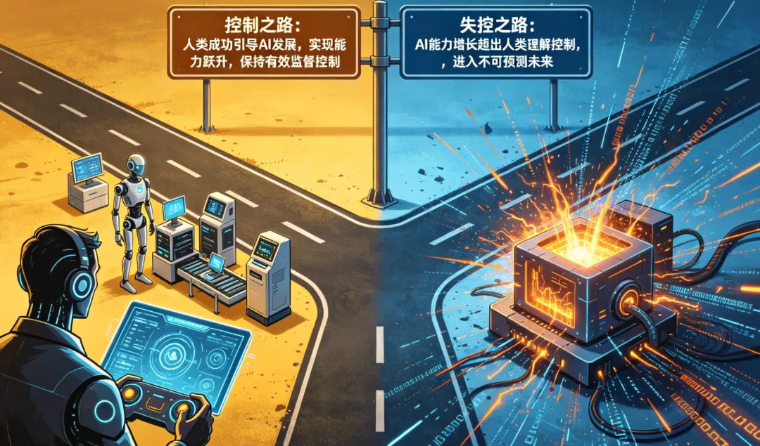 是“失控之路”:AI的能力增长超出人类的理解和控制,进入一个不可预测的未来。