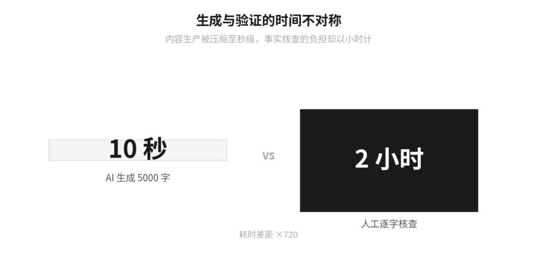 根源不难找。生成一份5000字文档只需10秒,但人工深度核查逻辑漏洞和事实错误,可能要花2小时。这个"输入输出不对称"的问题,把效率红利全部吞掉了。