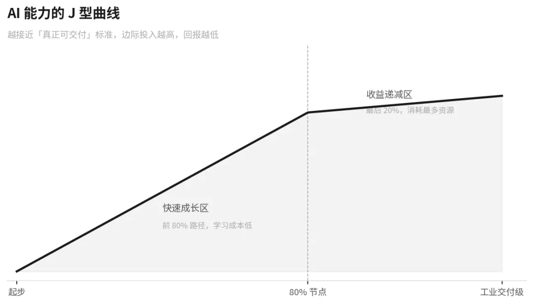 ▍能力J型曲线 AI帮你走完80%很快,但最后的20%——真正决定质量的部分——投入产出比极低,且往往要靠人的判断兜底。