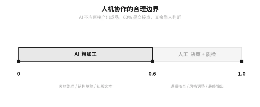 【02 明确人机分工】 AI负责从0到0.6的粗加工,人负责0.6到1.0的决策与质检。不要指望AI直接出成品。