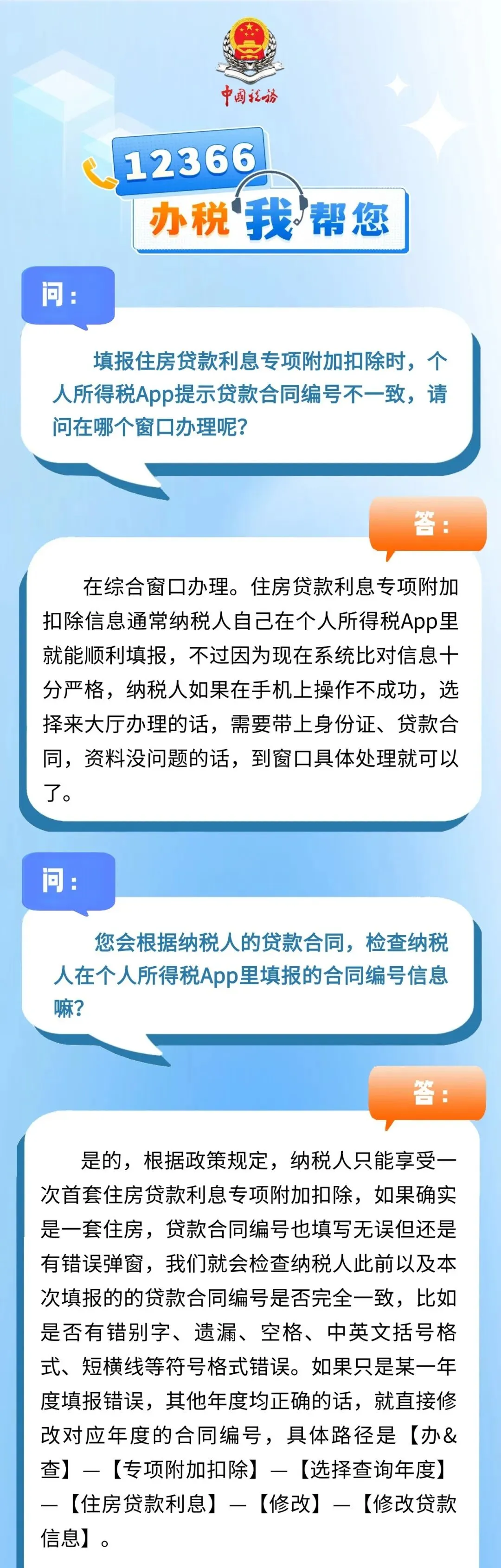 “12366办税我帮您”线下篇第4期来啦~本期纳税人的问题是在个人所得税App填报住房贷款利息专项附加扣除时,系统提示贷款合同编号不一致,如何办理?让我们跟着12366的小伙伴去办税大厅看看具体流程吧↓