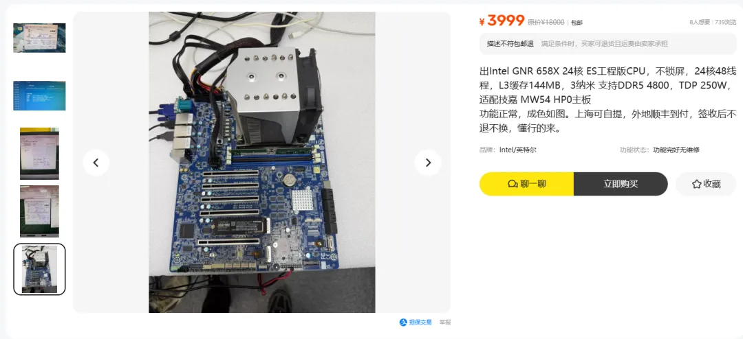 Intel至强658X,第六代至强Granite Rapids架构,Intel 3制程工艺。24核48线程,基频3.0GHz,睿频4.9GHz,144MB三级缓存。八通道DDR5内存,128条PCIe 5.0通道。正式版官方售价1869美元,折合人民币一万三千多。ES版不锁频,闲鱼3999到手,搭配技嘉MW54-HP0工作站主板,我在家里用它跑模型训练和实验。